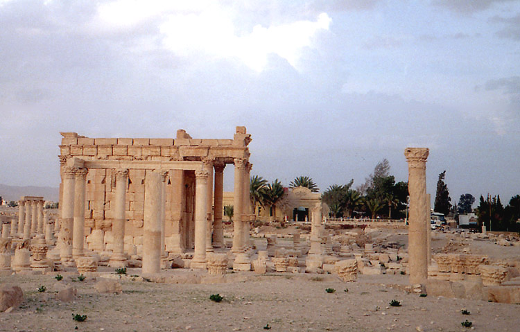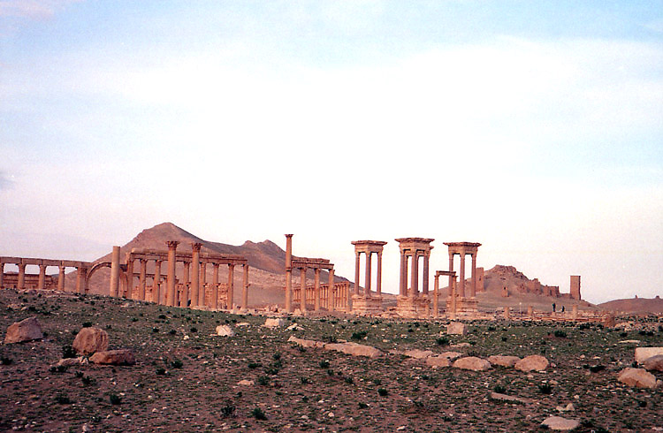 アラブ城で車は捨てて、徒歩で遺跡に向けて下っていった(もちろん登りも徒歩が可能)。葬祭殿のあたりから遺跡内に入り列柱道路をてくてくと歩いていく。列柱そのものは崩壊したところが多いのだが、それがかえって歴史を感じさせてくれる。視界には古代の建造物の遺構、乾燥した大地、そしてやや遠くにパルミラオアシスのナツメヤシの緑が広がる。