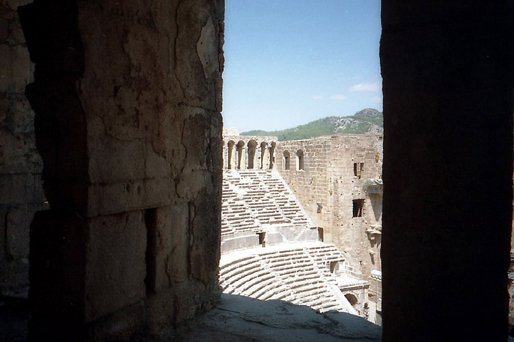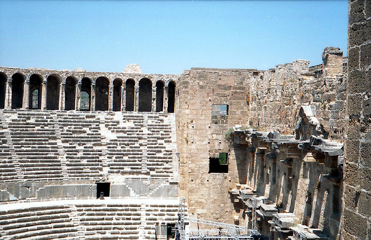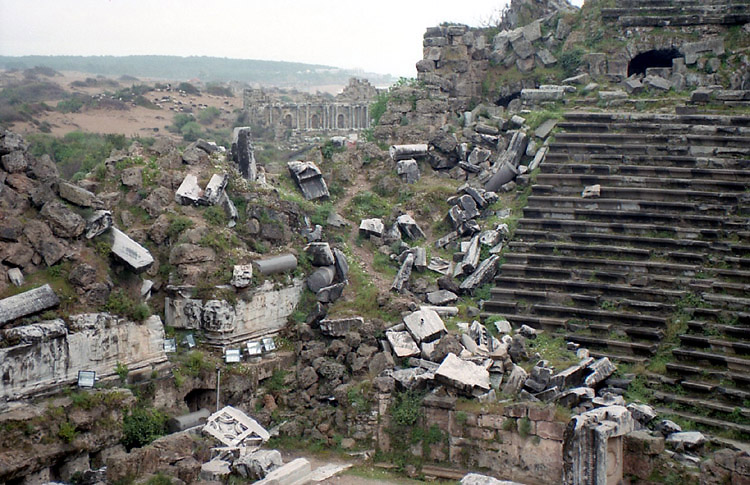 まずは、アスペンドスへ向かうことにした。当時、アンタルヤからアスペンドスの遺跡へダイレクトで行く公共の交通機関はないことになっていたが、念のためバスターミナルで尋ねてみた。するとやはり、最後は歩くか、タクシーかということだった(地球の歩き方にはバスがあると書いてあったが)。 アスペンドスの最寄の町セリク行きのバスに乗り(フロントガラスのところに、「セリク・アスペンドス」という行き先表示があったので期待したのだが、バス会社の人に「アスペンドス?」と問いかけても、エヴェット(イエス)という答えは帰ってこず、やはりアスペンドスまでは行ってくれない感じだった。 ところで、10時半少し前にアンタルヤのバスターミナルに着いたのだが、ちょうどマルマリス行きのバスが出るところだった。マルマリスまで行けば、ギリシャのロドス島はすぐである。明日はあのバスで行くことにしよう。ということでギリシャ行きを決断。 11時のバスで出発し、12時少し前にセリクに着いた。念のためバスの車掌にアスペンドスに行きたいという意思表示をすると、少し行ったところからバス(ドルムシュ)があるというので、そのあたりに人に尋ねたり探したりしてみたが見つけられず(長い時間待てばバスがやって来たのだと思うが)。結局はタクシーを利用することにした。 タクシーの運ちゃんはなかなか手ごわい交渉相手だった。というか一台しかいなかったので、完全に向こうのペースなのだ。往復約20キロ、観光中の待ち時間料金も込みで何とか20ドルにしたかったが、40ドルから始まったいい値が30ドルまで下がったところでピタッと止まってしまい、その金額で妥協するしかなかった。