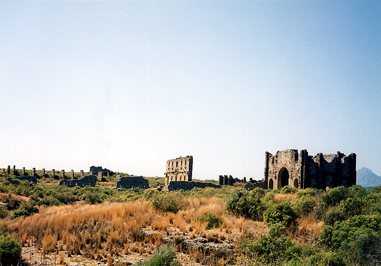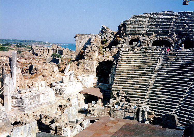 地中海岸の遺跡再訪2(アスペンドス・スィデ) 8月19日.朝から暑かった。ギリシャ行きはまだ決断できず。 8時半、旅先の自分にしては遅めの朝食をとり、絵葉書を数枚書いてから外出した。この日はアスペンドスとスィデに再訪する予定である。