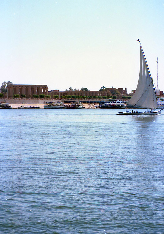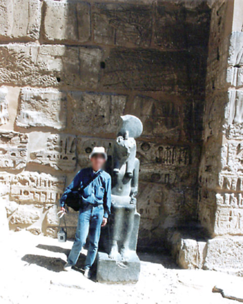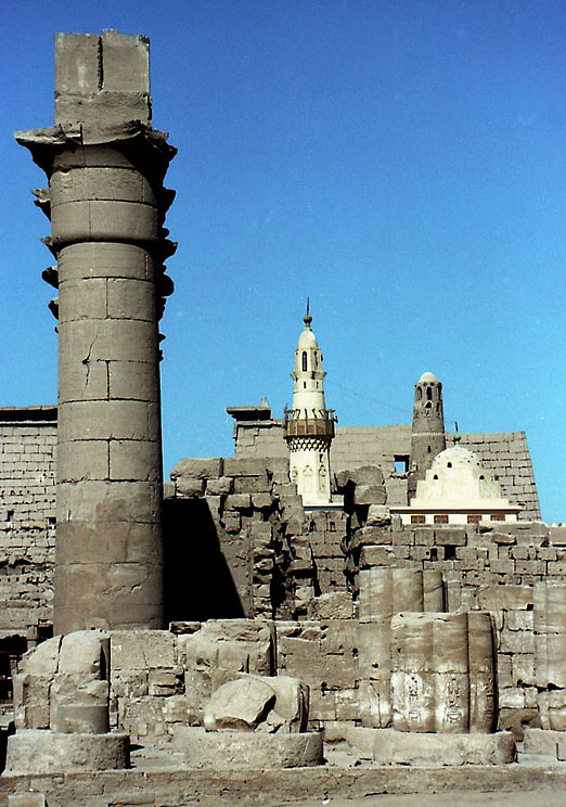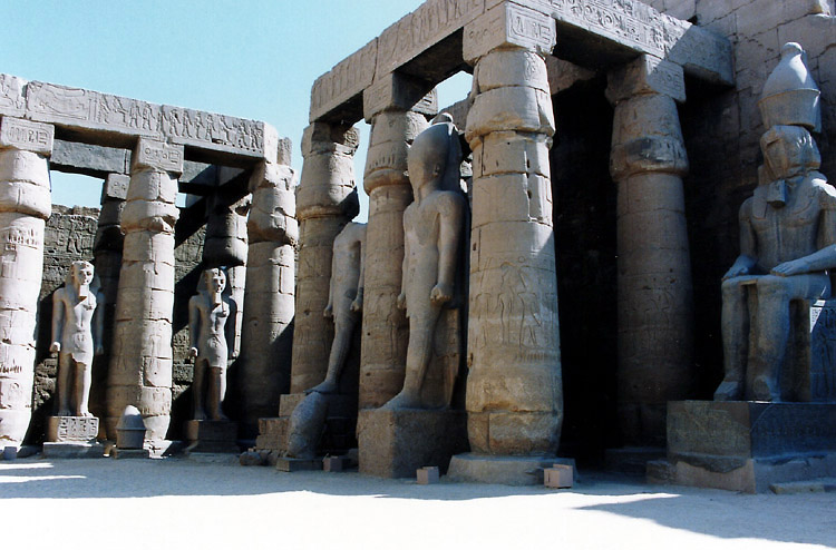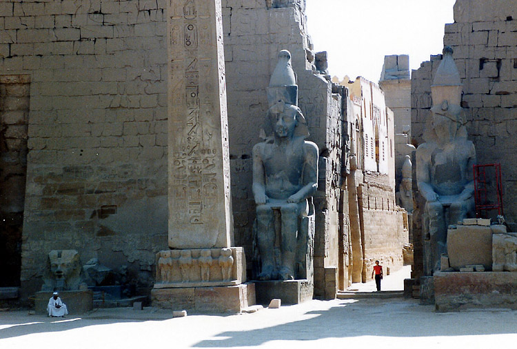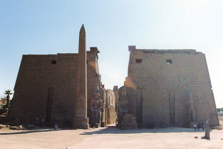 午後は徒歩で東岸の重要な神殿、ルクソール神殿へ行った。 ルクソール神殿は、年に1度、ナイル川の増水期にアモン神が妻のムト神と過ごすために訪れるオペト祭のためにつくられた、カルナック神殿に付属する神殿で、そのため、カルナック神殿とルクソール神殿の間は祭礼用の参道で結ばれ、ルクソール神殿には現在もその一部が残っている。 付属の神殿でありながら、このルクソール神殿もまた大きい。 神殿域内に入ると、第一塔門の前の1本のオベリスク(アモン・ラー信仰のシンボル)が目に入る。もともと2本あったのだが、向かって右側の1本が、1836年、エジプト総督ムハンマド・アリによってフランスに寄贈され、現在はパリのコンコルド広場に立っている。 ところで、この神殿に来た時間が悪かった。オベリスクやそのすぐ後ろの、ラムセス2世像の写真を撮ろうとすると逆光になるのだ。道理で外国人の団体が少ないわけだ。 ラムセス2世像のある第一塔門から第一中庭を通りさらに奥へ進むと、そこにはまた巨大な柱が並んでいる。パピルス型の柱頭やシュロ型の柱頭もすばらしいといわれているが、そんな知識は持たぬままルクソールに行ったので、ここでもその巨大さに圧倒されるばかりだった。