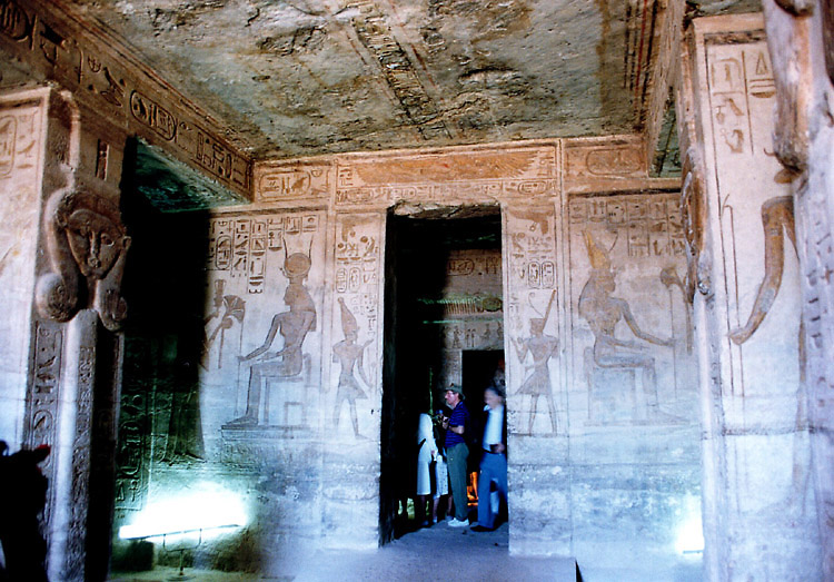 (3月12日) 緩やかな日程が続く。今日の観光は大小のアブシンベル神殿だけだ。 8時過ぎ、ホテルを出て、タクシーでアスワン空港に向かった。 空港は団体客でごった返していて、もちろん日本人の団体もいた。同じ便に乗った乗客もほとんど団体客だった。1日に何便飛んでいるのかはわからないが、この大勢の観光客をさばくために、ピストン輸送をしているという感じだ。 10時少し前、観光客で満席となった飛行機は飛び立ち、水平飛行に移るまもなく高度を下げ始めた。眼下にはナセル湖が広がっている。そして10時半ころ、アブシンベル空港到着。 アブシンベル空港から遺跡までは無料バスが連絡している。帰りの便のチェックインを済ませてからバスに乗ると、ものの10分もしないうちに遺跡の入口に着いた。いよいよアブシンベルの大遺跡だ。 アブシンベル神殿は、ヌビア地方まで支配下においたラムセス2世が、ヌビア人や近隣諸国にエジプトの強大さを誇示するために建造したと考えられている巨大建造物群の一つである。この貴重な遺跡が、1960年から始まったアスワンハイダムの建設でナセル湖に沈んでしまうということで、ユネスコによる遺跡救済事業が実施された。大小の神殿はブロックに切り分けられ、もとの場所から64メートル上へ引き上げられたそうだが、離れて見ると、建造された当時からここにあったとしか思われぬくらいうまく組み立ててある。 それにしても、大神殿の入口の左右に2体ずつ彫られているラムセス2世像は大きい。高さは20メートルもあるといことだ。ルクソールからそうなのだが、僕は、単純に大きいことで感動している。大きければいいというものではないが、大きいことと古いということが、僕にとって遺跡の価値をはかる重要な要素なのだ。現代人が見てもびっくりするのだから、これを見た古代人は、やはり王の権力の強大さを強く感じたのだろう。