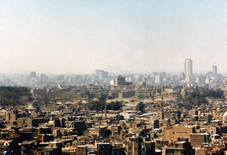 イスラム地区の南にはシタデル(城塞)がある。一応、地図で自分の現在地を確認しながら歩いているつもりなのだが、道路が規則正しく走っているわけではないので、なかなかシタデルに着けなかった。タハリールを出てから2時間余り歩き通しだから、7~8キロは歩いているはずだ。 入り組んだ町並を抜けると、ようやくシタデルらしきものが見えてきた。城塞だけあって小高い丘にあるのだが、疲労気味の足にはわずかな登り坂もきつい。おまけに後ろか子供が着いてきて、道を案内しようとする。どうせまた、バクシーシでも要求するつもりなのだろう。彼らを振り切るため最後の力をふりしぼってスピードをあげる。 喉がカラカラになったので、城塞に入るとすぐに売店でミネラルウォーターを買った。売店のおじさんは、「1ポンド」と言うが、横にいたおじさんが「75ピアストル」と教えてくれた。まったく油断もすきもあったものじゃない。たった25ピアストルなのだけれど。 城塞からの眺めはなかなかのものだった。カイロの市内が一望に見渡せる。何を見るとはなしに市内の方を眺めていると、地元の高校生が話しかけてきた。どうやら学校をさぼっているらしい。その学生に教えられて初めて気がついたのだが、ギザのピラミッドがうっすらと見えるではないか。砂塵か排気ガスかはわからないが、かすんでいるので彼らに教えられなければ気がつくことはなかっただろう。