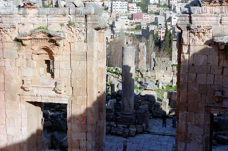 ジェラシュ (3月17日)5時頃、目が覚めた。熱は下がっている。何とかなったなと思う。 せっかくのきれいなバスルームだ。使っておかなければ損だと思いシャワーを浴びる。 8時、朝食のルームサービスの指定時間になった。僕は「8時から8時15分」の部分をチェックしておいたのだが、まもなくノックの音がした。どうしようもない安宿ばかりを泊り歩いてきたわけではないが、どちらかというと貧乏旅行の部類に入る旅をしてきたから、こういう世界もあるのか、という感じだった。 しぼりたてのオレンジジュースが実にうまい。しかし、パンケーキは思うようにのどを通らない。やはり食欲がでないのだ。紅茶で流し込むようにしてむりやり食べた。 10時に出発しようと決めて、またベッドに戻った。 予定通り10時すぎにチェックアウト。料金は税・サービス料合わせて、日本円に換算して約2万円だった。 タクシーでダウンタウンに出てホテルを探したが、思うようなホテルが見つからない。タクシーで下ってきた道を登って、まず、主要幹線を走るジェットバスのターミナルへ行き、翌日のアンマンーペトラ往復のチケットを買った。往復6ディナール(約1300円)。この国の物価は、まだまったく把握していないが、片道300キロ以上あるらしいから、高くないと思う。 その後、ジェットバスターミナルに割と近い中級ホテルにチェックインした。 さて、病み上がりだしゆっくり休みたいところだが、やならくてはならないことがある。シリアへの航空券の手配だ。ヨルダンーシリアの陸路での国境通過は難しいと聞いていたからだ(今となっては信じがたいことだが、レバノンに日本赤軍のメンバーがいたことから、陸路の国境越えをする日本人旅行者に対する警戒が強く、シリアからヨルダンへ陸路で入国するのは、困難であるという情報があった。僕の場合逆コースだったが、当時は詳しいガイドブックもなく、行って見なければわからないという状況だった)。 ヨルダン航空のオフィスへ行ってみると、2日後(19日)の便はなく、その翌日の便は満席だった。なんで、こんなに混んでいるのだろう? 日本人以外も陸路の国境越えは難しいのだろうか? しかし、これはかえってラッキーだった。陸路は無理と思ってあきらめていたのだが、どうもそうではないということがわかってきたのだ。 どこかの旅行会社が航空券を握っているのではと思い、一軒の旅行代理店を訪ねると、「アンマンーダマスカスの空路だと32ディナールもかかるが、陸路だと4~5ディナールで行けるよ」という。尋ねてみると、陸路に問題はないという。そこでダマスカス行きのバスのチケットを買いに、再びジェットバスターミナルへ向かった。 その途中、タクシーの運ちゃんに声をかけられた。ジェラシュへ行かないかという。ジェラシュは、ローマ、ビザンチンの支配下の都市として栄えたところで、是非見ておきたい遺跡だ。体調が悪くて乗り合いバスで行く気はなかったので、すぐに話に応じた。往復15ディナールで行ってくれるという。 アンマンからジェラシュまでは50キロほどで、15ディナール(3000円強)はちょっと高いかもしれないが、値切る元気もないし、時間も惜しい。ジェラシュに行って、帰りにジェットバスターミナルによってもらい、ダマスカス行きのチケットを買おう。そう思って、「OK」と言った。 やたらと明るいこの運転手のおじさん。100キロくらいのスピードで飛ばすし、手放し運転をして人を驚かせて喜んだりしている。そして、「名前は? 国は? 年齢は?」と聞いてくる。これはどこへ行っても聞かれるものだ。適当に答えておく。 そのうち、「あと10ディナールプラスしてアジュルン城(正式にはカラート・アル・ラバトというらしい)に行かないか」といい出した。ジェラシュだけで十分だと思っているのだが、このおじさん相当強引だ。「とにかくジェラシュに行ってくれ。アジュルン城のことはそれから考える」そう答えた。 ジェラシュは写真で見る以上にすばらしかった。南門の所の入口から少し行くと、ジェラシュのシンボルともいうべきフォーラムがある。円形の広場を囲むように列柱が並んでいる。この広場から北門に向かって、まっすぐ石畳の道が続き、両脇には列柱が並んでいる。エジプトの遺跡の柱よりずっと細くきゃしゃな柱だが、ごろんとした感じで、柱と柱も近接して窮屈な印象を受けたエジプトの遺跡のものよりも、洗練されたような感じを受ける。 列柱通りのバックは、相変わらず真っ青な空である。乾燥地帯なのでめったに雨は降らないのである。しかし、遺跡の周りは緑の芝におおわれていて、ところどころに名はわからぬが黄色い小さな花が咲いている。そういえば、空港に出迎えに来ていた日商岩井の現地駐在員が、「この季節は少しだが降雨があり緑がみられる」と話していたような気がする。 腹の方は落ち着いたみたいで、昼にに無理やり流し込んだサンドウィッチもなんとか消化し