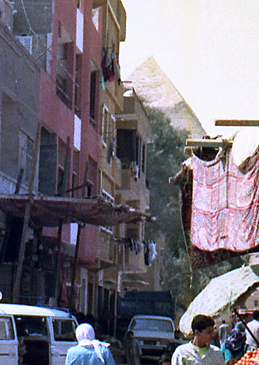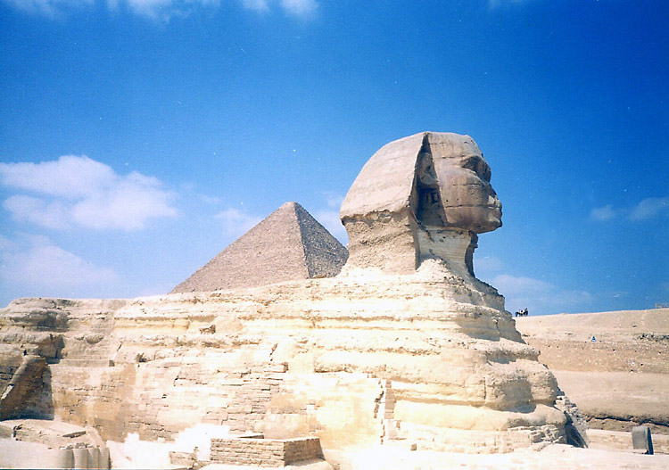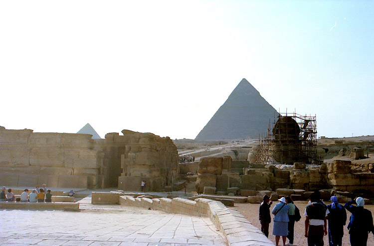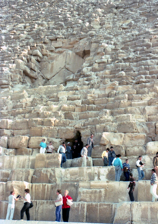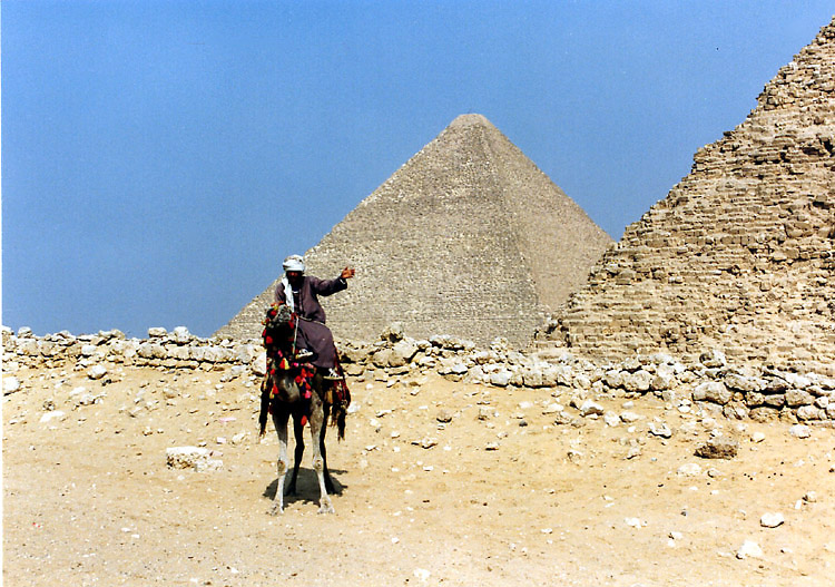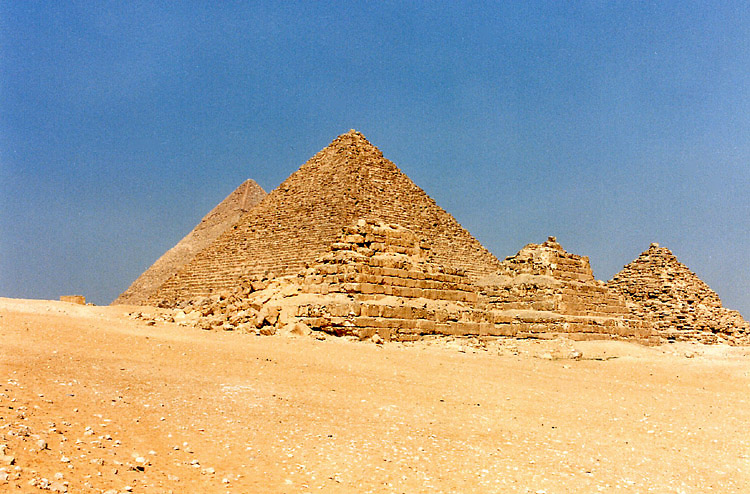 ギザには三つの巨大ピラミッド(三大ピラミッド)がある。およそ4500年前に建造された、エジプトの古王国第4王朝のクフ王、その息子のカフラー王、孫のメンカウラー王の3人のファラオのピラミッドである。ピラミッドについては、いまだ謎に包まれた部分が多いようなだが、4600年も前に人間が巨大な石材ブロックを積み上げて建造したということは月並みな言い方だが驚嘆すべきことで、現地で実物を見ると圧倒されるばかりだった。