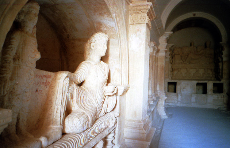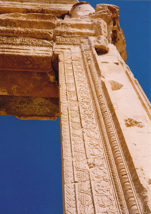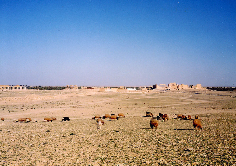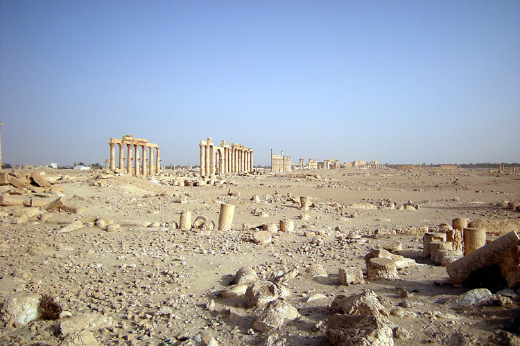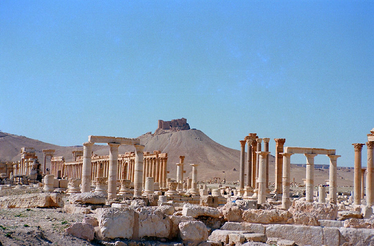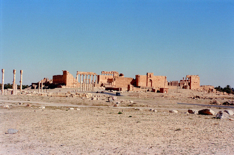 | パルミラはシリア砂漠のど真ん中に位置する。豊富な地下水が湧き出るオアシスで、紀元前1世紀から、地中海とメソポタミアを結ぶ交易路の中継地として栄えており、ローマ帝国と結んでいた。しかし、3世紀後半、パルミラの女王ゼノビアは、ローマから自立するという野心をいだき、結局ローマ軍に破れ、パルミラの街も壊滅に追い込まれた。ローマ帝国の街に特有の列柱道路が街の中心を貫いており、いくつかの神殿、劇場などの建造物が残る。(2015年、この地域を支配下に置いたISによっていくつかの建造物が爆破・破壊されてしまった。) 広大な遺跡だが、少し離れると遺跡全体を眺めことができる。パルミラ遺跡では、一つ一つの建造物やその遺構を見るよりも、ブラブラして遺跡の雰囲気に浸るのが個人的な好み。列柱の向こう側に沈む夕日も綺麗。
