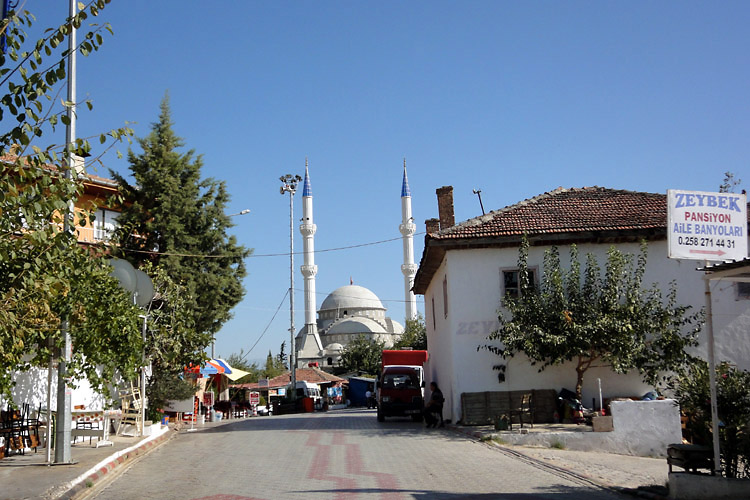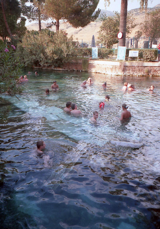 *1988年11月の旅日記 1988年の旅ではかなり詳細な旅日記を書いていた。そのなかのパムッカレの部分は次のような感じ。 「(デニズリのオトガルから乗った)パムッカレ行きのミニバスはデニズリの街の同じところをまわりだした。客集めだ。車掌役のおじさんが「パムッカレー、パムッカレー」と叫ぶ。「パムッカレー」の後に別に何か言っているが「パムッカレーはないかー」と聞こえる。 市街地を3周ほどしてからやっと郊外への道を走り出した。20分ほどで白い段々畑のような石灰棚が目の前に現れ、その縁に沿う坂道をバスはウインウインとうなりながらのぼっていった(今は車の立ち入りはできなくなっている)。石灰棚はもっと大規模なものかと思っていたが、小さなスキー場の距離は短いが少し傾斜のきつい中上級者向けコースという感じだ。……さっそくホテル捜しだ。石灰棚の麓にいけば安宿はたくさんあるようだが、石灰棚の上にある高級ホテルを奮発する。コッテージ式で一部屋一部屋玄関が別になっており、共同の中庭には温泉プールがあるという豪華さ。しかし、一泊朝食付きで日本円換算約2500円だった。ただ、これはシーズンオフ料金だから、オンシーズンはもっとするはずだが…。チェックインの後、石灰棚を見てから、さらに山の上の方にあるローマ時代の劇場に行ってみたが、エフェソスを見てしまった目には少々物足りない。遺跡を見た後、また石灰棚に戻ってきた。この石灰棚は夕暮れが美しいと言われている。靴を脱いで棚田のようにお湯がたまっている中に足を入れる。あまり暖かくない。お湯は上の段から下の段へと流れ落ちていくので、下の段へ行くと冷たいくらいだ。陽が傾くにつれて遠くの景色が逆光にかすんで、白い石灰棚が薄いオレンジ色になってきた。丁寧に構図を決めシャッターを切る。写真の出来上がりが楽しみであったが見ることができなくなってしまった(フィルムを失うという失態を演じてしまった)。ところで明かるい時間帯は美しい石灰棚だが、夜になるとそうでもない。昼食が軽かったので、日が暮れるとすぐに空腹に襲われた。ホテルの夕食時間が8時からと遅くて、それまで待ちきれそうにないので、石灰棚の下の安宿街まで歩いて出かけたのだが、石灰棚を照らす照明が寒々として何かナイタースキー場といった感じで、なおかつ白い斜面には誰もいないので、かなり不気味な光景だった。」 <カラハユット> カラハユットはパムッカレのすぐ北にある温泉地。ここへは2011年8月、スィデからイズミルまで長距離移動した日にちょっと寄り道した(時間がなかったのでパムッカレには寄らなかった)。