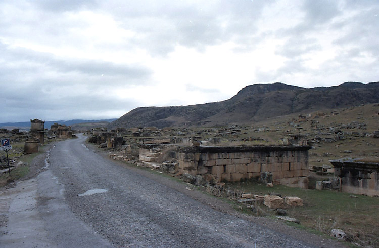 | <パムッカレ> パムッカレは温泉地で、その湯は高さ100mに及ぶ台地の斜面を伝って流れ落ち、湯に含まれた石灰分が結晶して階段状の石灰棚を形成している。しかし、乱開発のため温泉の湧出量が減少し、斜面を流れる湯量を抑え、また、景観保護のため石灰棚への自由な立ち入りは禁止され、遊歩道を歩いたり(裸足になる必要がある)、一部の石灰棚に入ることができるだけになっている。ここへは1988年11月、1992年3月、2002年8月に訪れている。1988年にはまだ、シーズンオフの11月であるにもかかわらず、石灰棚にどんどんお湯を流していた(残念ながら撮影済みのフィルムを失うという失態を演じてしまい写真はない)。まだ、温泉湧出量の減少が問題にはなっていなかったのだろうか? しかし、1992年3月には石灰棚へはお湯を流し込んではおらず(時々は流していたのか?)、このときには温泉の枯渇への対応が強く意識されていたのだと思われる。2002年8月にはごく一部の石灰棚のみにお湯を流すように調節されており(お湯がないと美しくないし、また流すことにより白さを維持しているらしく流す場所を計画的に変えているらしい-遊歩道脇は常に流していると思われるが)、また、観光客は自由に歩き回ることが禁止されていた。