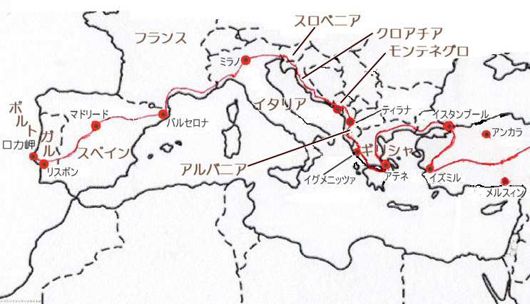 ◆イグメニッツァ(ギリシャ)~アテネ(ギリシャ)=バス ◆アテネ~パレオファルサロス(ギリシャ)(ここからメテオラ観光の最寄駅カランバカ行きに乗換え)=鉄道 ◆パレオファルサロス~テッサロニキ(ギリシャ)=鉄道 ◆テッサロニキ~イスタンブール(トルコ)=鉄道 12.2007年3月:イグメニッツァ(ギリシャ)~ミラノ(イタリア) ◆イグメニッツァ~イオアニナ(ギリシャ)=バス ◆イオアニナ~カカビア(アルバニアとの国境のギリシャ側ボーダー)=バス ◆ギリシャとの国境のアルバニア側ボーダー~サランダ(アルバニア)=タクシー(ジロカステロへ行くアルバニア人とタクシーをシェアしてサランダとの分岐点で下車、そこから白タク) ◆サランダ~ドレス(アルバニア)=バス(ティラナ行きのバスに乗ったがドレスの中心部を通らないバスだったようで-下車場所をミスった可能性もあり-1時間半くらい徒歩) ◆ドレス(~フィエール=アポロニ観光のため少し戻る)~ティラナ(アルバニア)=バス ◆ティラナ~シュコードラ(アルバニア)=バス ◆シュコードラ~モンテネグロとの国境のアルバニア側ボーダー=旅行会社の車 ◆モンテネグロ側のボーダー~ポドゴリッツァ(モンテネグロ)=タクシー ◆ポドゴリッツァ~コトルモンテネグロ)=バス ◆コトル~スプリット(クロアチア)=バス(途中ボスニアヘルツェゴビナ領内を通過) ◆スプリット~シベニク(クロアチアイ)=バス ◆シベニク~サダル(クロアチア)=バス ◆サダル~リエカ(クロアチア)=バス ◆リエカ~トリエステ(イタリア)=バス(途中スロベニア領内を通過) ◆トリエステ~ウーディネ(イタリア)=鉄道 ◆ウーディネ~ヴィチェンツァ(イタリア)=鉄道 ◆ヴィチェンツァ~ヴェローナ(イタリア)=鉄道 ◆ヴェローナ~ミラノ(イタリア)=鉄道 13.2010年8月:ミラノ(イタリア)~ロカ岬(ポルトガル) ◆ミラノ(イタリア)~ヴェンティミーリア(イタリア)=鉄道 ◆ヴェンティミーリア~ニース(フランス)=鉄道 ◆ニース~マルセイユ(フランス)=鉄道 ◆マルセイユ~モンペリエ(フランス)=鉄道 ◆モンペリエ~ジローナ(スペイン)=鉄道 ◆ジローナ~バルセロナ(スペイン)=鉄道 ◆バルセロナ~マドリード(スペイン)=鉄道 ◆マドリード~バダホス=(スペイン)鉄道 ◆バダホス~エルヴァス(ポルトガル)=タクシー(日曜でバスがなかったため) ◆エルヴァス~エヴォラ(ポルトガル)=バス ◆エヴォラ~リスボン(ポルトガル)=バス ◆リスボン~シントラ(ポルトガル)=鉄道 ◆シントラ~ロカ岬(ポルトガル)=バス |