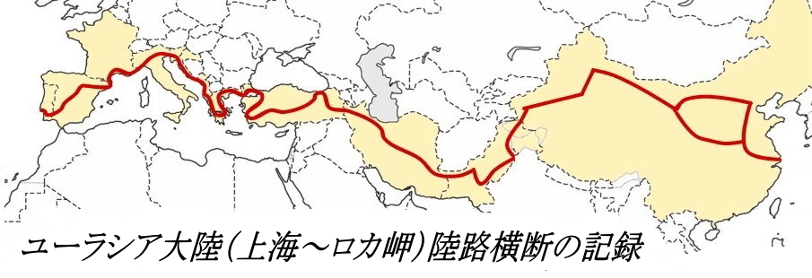 世間には陸路国境越えマニアみたいな旅行者がいるようだが、自分にもその傾向があり、そうした旅と普通の旅で通ったルートをつなげると、中国の上海からポルトガルのロカ岬までユーラシア大陸の陸路を踏破したことになった。最初から陸路踏破を目標にしていたわけではないので、移動の方向は西から東へだったり、東から西へだったりして一定しないし、ロカ岬はユーラシア大陸の最西端だが、上海は最東端ではないので中途半端なユーラシア大陸陸路横断だと思う(ただ最東端はたぶん普通の旅行は困難な場所っぽい)。しかし、移動したルートを地図上に記してみると(上の地図の赤い線)、我ながらなかなかのものだったので、超個人的な記録としてアップすることにした(2026年1月)。