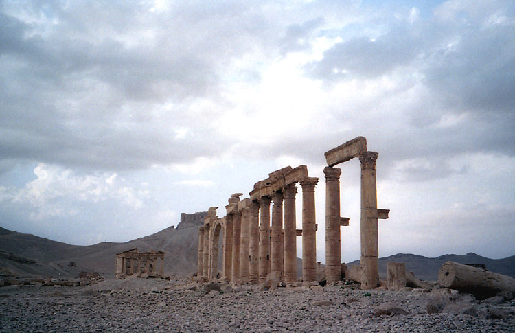 アラブ城で車は捨てて、徒歩で遺跡に向けて下っていった(もちろん登りも徒歩が可能)。葬祭殿のあたりから遺跡内に入り列柱道路をてくてくと歩いていく。列柱そのものは崩壊したところが多いのだが、それがかえって歴史を感じさせてくれる。視界には古代の建造物の遺構、乾燥した大地、そしてやや遠くにパルミラオアシスのナツメヤシの緑が広がる。
