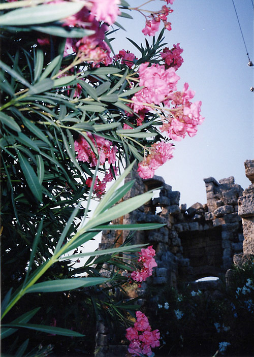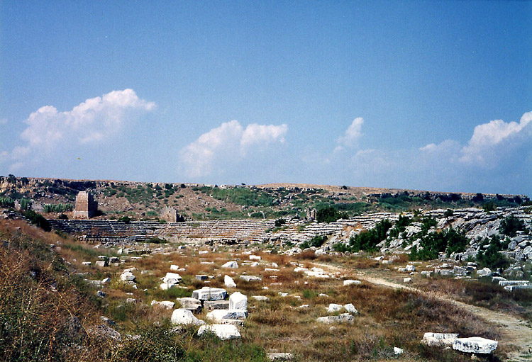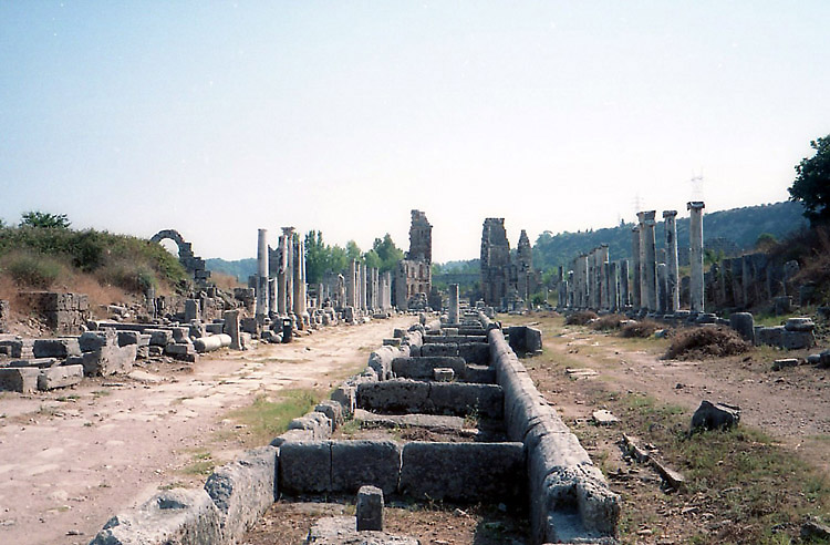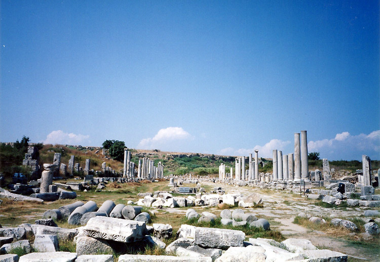 地中海岸の遺跡再訪1(ペルゲ) 2004年8月、またまたトルコへ出かけることにした。以前訪れたとき雨にたたられたアンタルヤ周辺のペルゲ・アスペンドス・スィデなどの遺跡をめぐり、まだ行ったことのないクサントスなどにも行き、時間が余ったら久しぶりにカッパドキアにでも行ってレンタサイクルで走ろうかと考えた。真夏のカッパドキアを自転車で走るなら帽子でもないときついだろうと考え、キャップも購入し準備万端整えていた。ただ、トルコの隣国ギリシャで開催されているオリンピックも若干気になっていた。2021年に開催された東京オリパラにおける金まみれの汚さに幻滅するまで、それなりにお金で動いている部分があったとしても仕方がない部分もあるだろうと思い、オリンピックなるイベントはどちらかといえば好きだった。そんなわけで計画段階でアテネ行きの可能性もさぐってみたが、ホテルが空いているかどうかわからない、かつ、料金もバカ高のようで、おとなしくトルコだけ旅して帰国すべきだろうという、一応の結論に達した。 8月17日の昼過ぎ成田を出発。飛行機はトルコ航空とJALのコードシェア便で、僕の航空券はJALの特典航空券である。この特典航空券というのが、あとあと効いてくる。 12時間の空の旅を終えてトルコ時間の午後8時半すぎにイスタンブールのアタチュルク国際空港に到着。入国後は両替をして、すぐに空港バスで新市街に向かった。 トルコには2002年から3年連続で訪れていたが、1ドル=約150万トルコリラであまり変化がなかった。どうやらトルコリラの激しい下落は止まったままのようだった。しかし、空港バスは前年の700万リラから750万リラに値上がりしており、インフレ自体は続いているようだった。 珍しく初日のホテルは予約していった。出発前にイスタンブールの旧市街で爆弾テロが起きており、夜にホテルを探して(イスタンブールは慣れ親しんだ街なので「探す」というか「選り好みして」ということ)、旧市街をうろうろするのは避けようというわけだ。 8月18日朝、地中海岸の観光の拠点となるアンタルヤまで飛ぶべく空港バスで空港へ移動。アンタルヤまでの航空券は日本で確保済みである。 11時25分、ほぼ満席の状態でアンタルヤ行きの便は出発。約1時間で到着。 アンタルヤ空港からアンタルヤまでも空港バスで出たが、ここの料金も750万トルコリラ。 1時半過ぎに市内に到着。勝手知ったる街である。カレイチとよばれる旧市街にホテルをとろうということで、どんどん歩いていく。ホテル探しはパッと終わらせて、今日のうちにペルゲ遺跡だけでも行っておきたい。 ホテルはエアコン付きというのが条件。旅行期間も短いしケチケチ旅行はしないつもりである。アンタルヤ港を見おろす高台の上にあるティルク・エヴィ・ホテルという小奇麗なホテルにチェックイン(城壁の内側に作られているので部屋からは港は見えない)。 2時すぎに外出して遅い昼食をとり、ペットボトルの水を購入してペルゲへと向かった。 以前は、アンタルヤからタクシーでペルゲ・アスペンドス・スィデと回ったのだが、今回はできうるかぎりバスやドルムシュで行こうということでやって来た。 まず、メイダンというところまで行き、そこからバスに乗ってペルゲ遺跡最寄の町アクスへ向かう。 3時20分、メイダンから約20分でアクス到着。ここからペルゲまでは2キロの道のりがあるが、公共の交通機関はない。タクシーはなるべく使わないという方針なので歩く。ただ、日差しが強烈である。かばんから雨傘を取り出して、これを日傘として使って歩いていった。日傘という傘の使い方が珍しいのか、途中、地元の人たちにジロジロ見られる。 25分くらいでペルゲ遺跡の入口に到着。
