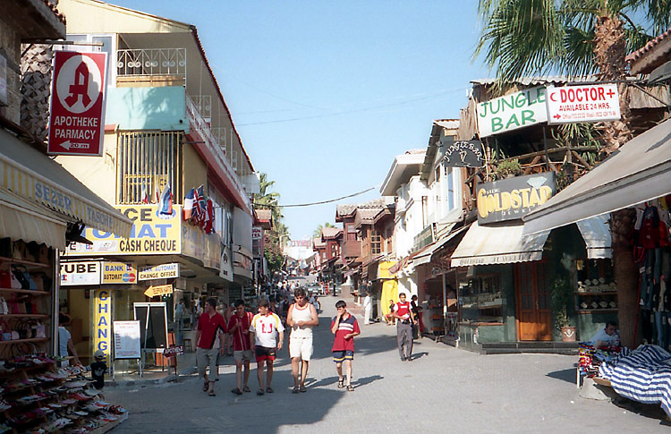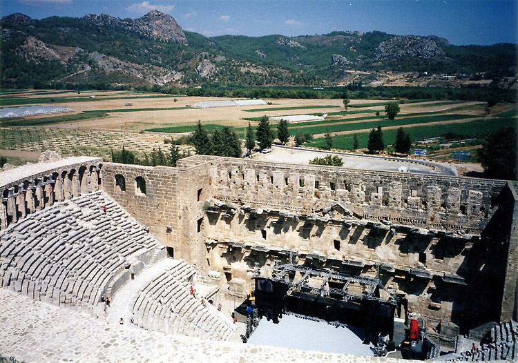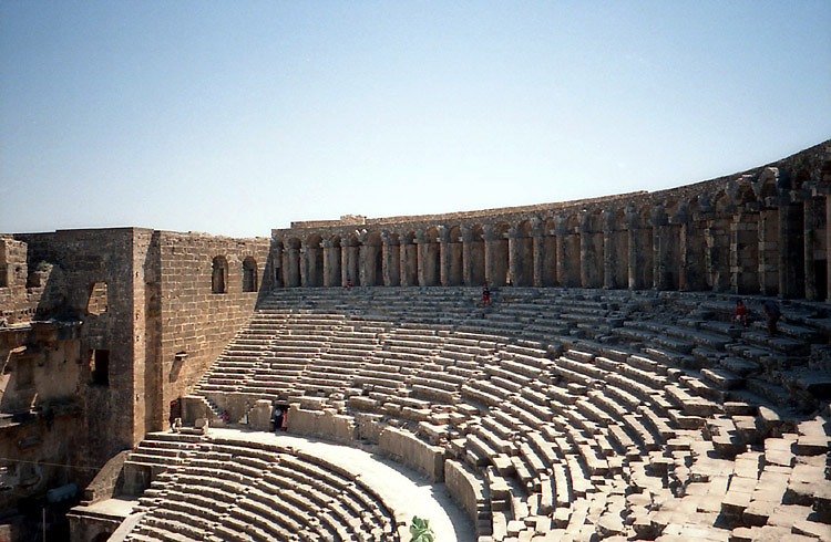 まずは、アスペンドスへ向かうことにした。当時、アンタルヤからアスペンドスの遺跡へダイレクトで行く公共の交通機関はないことになっていたが、念のためバスターミナルで尋ねてみた。するとやはり、最後は歩くか、タクシーかということだった(地球の歩き方にはバスがあると書いてあったが)。 アスペンドスの最寄の町セリク行きのバスに乗り(フロントガラスのところに、「セリク・アスペンドス」という行き先表示があったので期待したのだが、バス会社の人に「アスペンドス?」と問いかけても、エヴェット(イエス)という答えは帰ってこず、やはりアスペンドスまでは行ってくれない感じだった。 ところで、10時半少し前にアンタルヤのバスターミナルに着いたのだが、ちょうどマルマリス行きのバスが出るところだった。マルマリスまで行けば、ギリシャのロドス島はすぐである。明日はあのバスで行くことにしよう。ということでギリシャ行きを決断。 11時のバスで出発し、12時少し前にセリクに着いた。念のためバスの車掌にアスペンドスに行きたいという意思表示をすると、少し行ったところからバス(ドルムシュ)があるというので、そのあたりに人に尋ねたり探したりしてみたが見つけられず(長い時間待てばバスがやって来たのだと思うが)。結局はタクシーを利用することにした。 タクシーの運ちゃんはなかなか手ごわい交渉相手だった。というか一台しかいなかったので、完全に向こうのペースなのだ。往復約20キロ、観光中の待ち時間料金も込みで何とか20ドルにしたかったが、40ドルから始まったいい値が30ドルまで下がったところでピタッと止まってしまい、その金額で妥協するしかなかった。