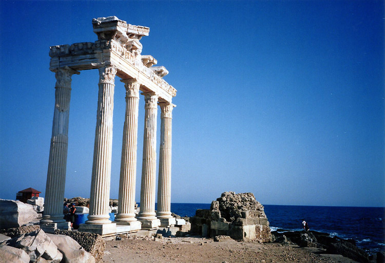 いったんセリクの町に戻り、スィデに向かった。スィデ直通のバスもなく(少なく)、いったんバスでマナヴガットというところまで行き、そこからドルムシュに乗り換えなければならない。 セリクを3時15分頃出て、スィデには4時半ころ到着した。 スィデは紀元前7世紀にギリシャ人によって造られた植民都市で、アレキサンダー大王に破壊されたが、1~2世紀に大いに繁栄したという。半島状になった場所にある遺跡で、海風が心地よいのではと思ったが、日差しがきつく、のんびり歩けるという状態ではなかった。このへんの遺跡見物は春の天気の良い日に限ると、何回かの真夏の訪問で学習したはずなのだが、学習が活かされていない。