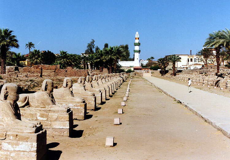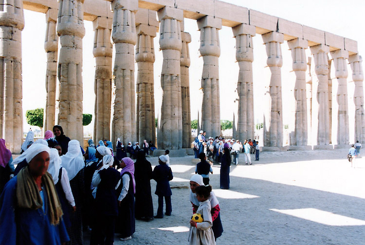午後は徒歩で東岸の重要な神殿、ルクソール神殿へ行った。 ルクソール神殿は、年に1度、ナイル川の増水期にアモン神が妻のムト神と過ごすために訪れるオペト祭のためにつくられた、カルナック神殿に付属する神殿で、そのため、カルナック神殿とルクソール神殿の間は祭礼用の参道で結ばれ、ルクソール神殿には現在もその一部が残っている。 付属の神殿でありながら、このルクソール神殿もまた大きい。 神殿域内に入ると、第一塔門の前の1本のオベリスク(アモン・ラー信仰のシンボル)が目に入る。もともと2本あったのだが、向かって右側の1本が、1836年、エジプト総督ムハンマド・アリによってフランスに寄贈され、現在はパリのコンコルド広場に立っている。 ところで、この神殿に来た時間が悪かった。オベリスクやそのすぐ後ろの、ラムセス2世像の写真を撮ろうとすると逆光になるのだ。道理で外国人の団体が少ないわけだ。 ラムセス2世像のある第一塔門から第一中庭を通りさらに奥へ進むと、そこにはまた巨大な柱が並んでいる。パピルス型の柱頭やシュロ型の柱頭もすばらしいといわれているが、そんな知識は持たぬままルクソールに行ったので、ここでもその巨大さに圧倒されるばかりだった。