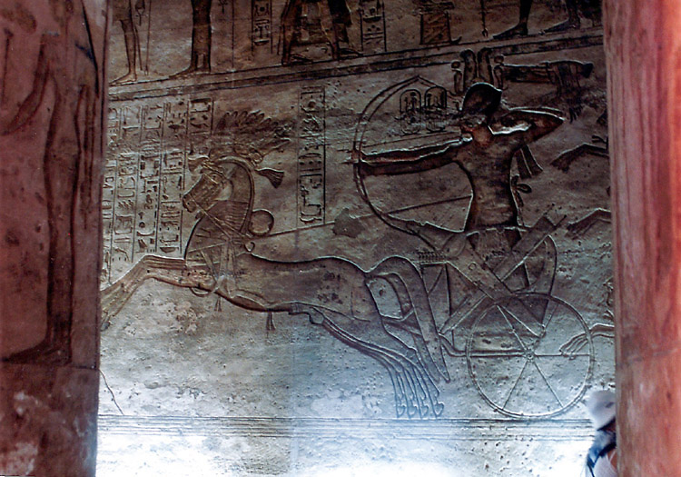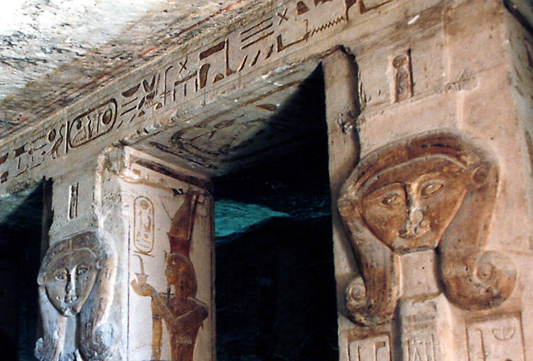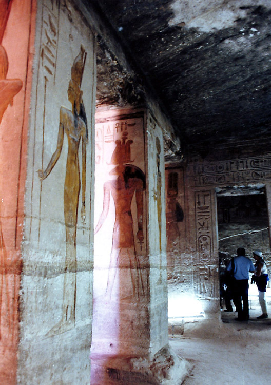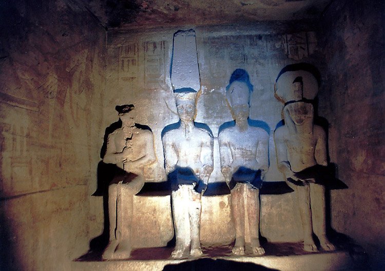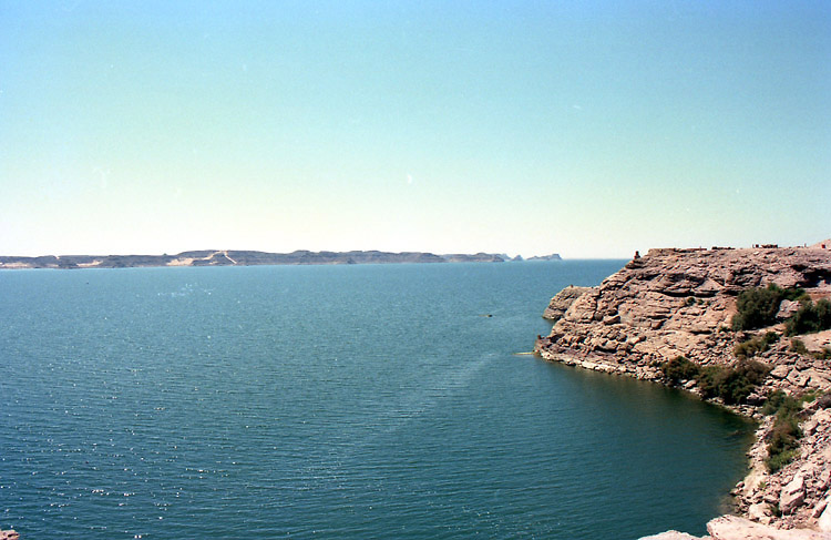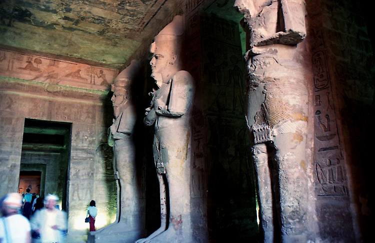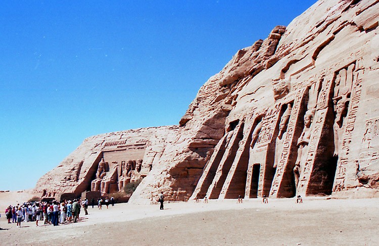 (3月12日) 緩やかな日程が続く。今日の観光は大小のアブシンベル神殿だけだ。 8時過ぎ、ホテルを出て、タクシーでアスワン空港に向かった。 空港は団体客でごった返していて、もちろん日本人の団体もいた。同じ便に乗った乗客もほとんど団体客だった。1日に何便飛んでいるのかはわからないが、この大勢の観光客をさばくために、ピストン輸送をしているという感じだ。 10時少し前、観光客で満席となった飛行機は飛び立ち、水平飛行に移るまもなく高度を下げ始めた。眼下にはナセル湖が広がっている。そして10時半ころ、アブシンベル空港到着。 アブシンベル空港から遺跡までは無料バスが連絡している。帰りの便のチェックインを済ませてからバスに乗ると、ものの10分もしないうちに遺跡の入口に着いた。いよいよアブシンベルの大遺跡だ。 アブシンベル神殿は、ヌビア地方まで支配下においたラムセス2世が、ヌビア人や近隣諸国にエジプトの強大さを誇示するために建造したと考えられている巨大建造物群の一つである。この貴重な遺跡が、1960年から始まったアスワンハイダムの建設でナセル湖に沈んでしまうということで、ユネスコによる遺跡救済事業が実施された。大小の神殿はブロックに切り分けられ、もとの場所から64メートル上へ引き上げられたそうだが、離れて見ると、建造された当時からここにあったとしか思われぬくらいうまく組み立ててある。 それにしても、大神殿の入口の左右に2体ずつ彫られているラムセス2世像は大きい。高さは20メートルもあるといことだ。ルクソールからそうなのだが、僕は、単純に大きいことで感動している。大きければいいというものではないが、大きいことと古いということが、僕にとって遺跡の価値をはかる重要な要素なのだ。現代人が見てもびっくりするのだから、これを見た古代人は、やはり王の権力の強大さを強く感じたのだろう。