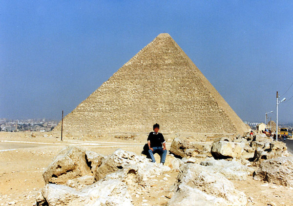 エジプト航空との闘いとギザのピラミッド (3月13日)アスワンからの飛行機は昼過ぎにカイロに到着した。16日に乗るアンマン行きの便の出発がどのターミナルかを確認してからタクシーで市内に向かい、T君に教えてもらったラムセス駅近くのパレスホテルというホテルへ行った。名前はすごいが安宿である。シングル、シャワー・トイレ付き、朝食代込みで、ソファーを置いてある別室(とはいっても三畳程の広さだが)まであって14ポンドちょっとだ。カイロにしては安い部類だろう。給湯は各部屋についている電気ヒーターに頼らなくてはならないので、連続・大量に湯を使うのが難しいのが唯一の弱点だ。