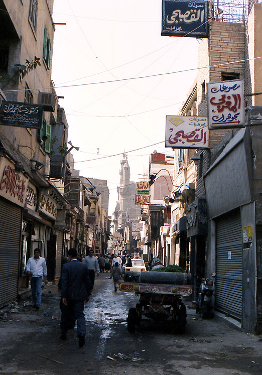 食中毒? (3月15日)この日はカイロの中心、タハリール(ナイルヒルトンなどのある場所)から旧市街、イスラミックカイロに歩いて出た。 イスラミックカイロの北はアズハル地区といわれ(南はシタデル地区)、19世紀に新市街が作られるまでカイロの中心として栄えたところで、古い建物が多く残っている。また、ハーン・ハーリーというカイロ最大のバザールがあり土産物屋が集中している。午前中ということもあり、まだ閑散としているハーン・ハーリーを少しのぞいてから、町並をカメラにおさめながら歩いた。