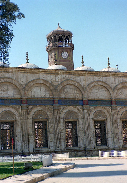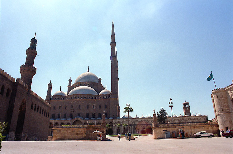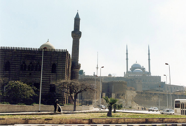 イスラム地区の南にはシタデル(城塞)がある。一応、地図で自分の現在地を確認しながら歩いているつもりなのだが、道路が規則正しく走っているわけではないので、なかなかシタデルに着けなかった。タハリールを出てから2時間余り歩き通しだから、7~8キロは歩いているはずだ。 入り組んだ町並を抜けると、ようやくシタデルらしきものが見えてきた。城塞だけあって小高い丘にあるのだが、疲労気味の足にはわずかな登り坂もきつい。おまけに後ろか子供が着いてきて、道を案内しようとする。どうせまた、バクシーシでも要求するつもりなのだろう。彼らを振り切るため最後の力をふりしぼってスピードをあげる。 喉がカラカラになったので、城塞に入るとすぐに売店でミネラルウォーターを買った。売店のおじさんは、「1ポンド」と言うが、横にいたおじさんが「75ピアストル」と教えてくれた。まったく油断もすきもあったものじゃない。たった25ピアストルなのだけれど。 城塞からの眺めはなかなかのものだった。カイロの市内が一望に見渡せる。何を見るとはなしに市内の方を眺めていると、地元の高校生が話しかけてきた。どうやら学校をさぼっているらしい。その学生に教えられて初めて気がついたのだが、ギザのピラミッドがうっすらと見えるではないか。砂塵か排気ガスかはわからないが、かすんでいるので彼らに教えられなければ気がつくことはなかっただろう。