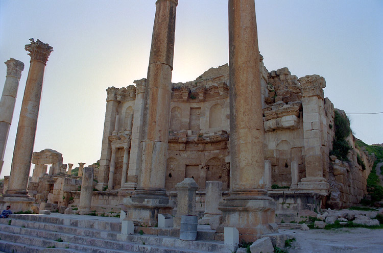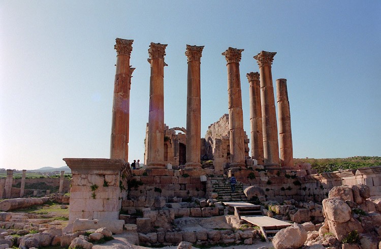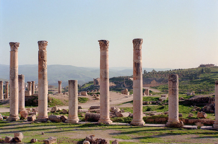 ジェラシュ (3月17日)5時頃、目が覚めた。熱は下がっている。何とかなったなと思う。 せっかくのきれいなバスルームだ。使っておかなければ損だと思いシャワーを浴びる。 8時、朝食のルームサービスの指定時間になった。僕は「8時から8時15分」の部分をチェックしておいたのだが、まもなくノックの音がした。どうしようもない安宿ばかりを泊り歩いてきたわけではないが、どちらかというと貧乏旅行の部類に入る旅をしてきたから、こういう世界もあるのか、という感じだった。 しぼりたてのオレンジジュースが実にうまい。しかし、パンケーキは思うようにのどを通らない。やはり食欲がでないのだ。紅茶で流し込むようにしてむりやり食べた。 10時に出発しようと決めて、またベッドに戻った。 予定通り10時すぎにチェックアウト。料金は税・サービス料合わせて、日本円に換算して約2万円だった。 タクシーでダウンタウンに出てホテルを探したが、思うようなホテルが見つからない。タクシーで下ってきた道を登って、まず、主要幹線を走るジェットバスのターミナルへ行き、翌日のアンマンーペトラ往復のチケットを買った。往復6ディナール(約1300円)。この国の物価は、まだまったく把握していないが、片道300キロ以上あるらしいから、高くないと思う。 その後、ジェットバスターミナルに割と近い中級ホテルにチェックインした。 さて、病み上がりだしゆっくり休みたいところだが、やならくてはならないことがある。シリアへの航空券の手配だ。ヨルダンーシリアの陸路での国境通過は難しいと聞いていたからだ(今となっては信じがたいことだが、レバノンに日本赤軍のメンバーがいたことから、陸路の国境越えをする日本人旅行者に対する警戒が強く、シリアからヨルダンへ陸路で入国するのは、困難であるという情報があった。僕の場合逆コースだったが、当時は詳しいガイドブックもなく、行って見なければわからないという状況だった)。 ヨルダン航空のオフィスへ行ってみると、2日後(19日)の便はなく、その翌日の便は満席だった。なんで、こんなに混んでいるのだろう? 日本人以外も陸路の国境越えは難しいのだろうか? しかし、これはかえってラッキーだった。陸路は無理と思ってあきらめていたのだが、どうもそうではないということがわかってきたのだ。 どこかの旅行会社が航空券を握っているのではと思い、一軒の旅行代理店を訪ねると、「アンマンーダマスカスの空路だと32ディナールもかかるが、陸路だと4~5ディナールで行けるよ」という。尋ねてみると、陸路に問題はないという。そこでダマスカス行きのバスのチケットを買いに、再びジェットバスターミナルへ向かった。 その途中、タクシーの運ちゃんに声をかけられた。ジェラシュへ行かないかという。ジェラシュは、ローマ、ビザンチンの支配下の都市として栄えたところで、是非見ておきたい遺跡だ。体調が悪くて乗り合いバスで行く気はなかったので、すぐに話に応じた。往復15ディナールで行ってくれるという。 アンマンからジェラシュまでは50キロほどで、15ディナール(3000円強)はちょっと高いかもしれないが、値切る元気もないし、時間も惜しい。ジェラシュに行って、帰りにジェットバスターミナルによってもらい、ダマスカス行きのチケットを買おう。そう思って、「OK」と言った。 やたらと明るいこの運転手のおじさん。100キロくらいのスピードで飛ばすし、手放し運転をして人を驚かせて喜んだりしている。そして、「名前は? 国は? 年齢は?」と聞いてくる。これはどこへ行っても聞かれるものだ。適当に答えておく。 そのうち、「あと10ディナールプラスしてアジュルン城(正式にはカラート・アル・ラバトというらしい)に行かないか」といい出した。ジェラシュだけで十分だと思っているのだが、このおじさん相当強引だ。「とにかくジェラシュに行ってくれ。アジュルン城のことはそれから考える」そう答えた。 ジェラシュは写真で見る以上にすばらしかった。南門の所の入口から少し行くと、ジェラシュのシンボルともいうべきフォーラムがある。円形の広場を囲むように列柱が並んでいる。この広場から北門に向かって、まっすぐ石畳の道が続き、両脇には列柱が並んでいる。エジプトの遺跡の柱よりずっと細くきゃしゃな柱だが、ごろんとした感じで、柱と柱も近接して窮屈な印象を受けたエジプトの遺跡のものよりも、洗練されたような感じを受ける。 列柱通りのバックは、相変わらず真っ青な空である。乾燥地帯なのでめったに雨は降らないのである。しかし、遺跡の周りは緑の芝におおわれていて、ところどころに名はわからぬが黄色い小さな花が咲いている。そういえば、空港に出迎えに来ていた日商岩井の現地駐在員が、「この季節は少しだが降雨があり緑がみられる」と話していたような気がする。 腹の方は落ち着いたみたいで、昼にに無理やり流し込んだサンドウィッチもなんとか消化し