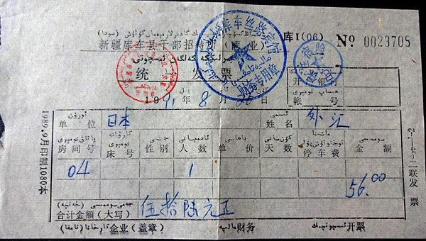 25日。 10時半、約束通り前日の運転手の運転する前日の車がやって来た。運転手は王さん。漢民族だ。 まずガソリンスタンドへ行った。道は週1回の大バザールへ向かう馬車・ロバ車で一杯だ。 スタンドに着いても王さんは給油はせず、スタンドの人と話をしているだけだった。30分くらいたって、馬車・ロバ車の洪水の中に出た。いよいよウルムチへ向けて出発かと思っていると、今度は老賓館というホテルの敷地内へ入って止まった。どうやら王さんの車はこのホテル所属の車らしく、一旦車を降りた彼は、ある建物のから、何か書類と予備のガソリンタンクを持って出てきた。しかし、またまた、すぐには出発せず、王さんは、知人と「これからウルムチだ」「ホー」「客はこの日本人一人か」「そうだ」「ホー」という感じの会話をしている。 30分くらいたってホテルを出て、今度こそ出発かと思っていると、車は学校のグラウンドみたいな所に入って行った。そこに隣接する王さんの自宅に寄ったのだ。長距離出張ということからか、上着や小さなバッグを持って出てきた。 そして12時ころ、やっとウルムチへ向かう道へ出た。 道の状態は比較的よく、90キロくらいで快走していく。太陽の光がまぶしい。 1時間半も走ると、まぶしさもあってか、眠くなってきた。目をあけているのがつらいが、眠るわけにはいかない。相当なスピードで走っているし、道もカシュガルから遠ざかるにつれて悪くなってきた。シートベルトはないし、車のタイヤも完全なボウズだ。眠っていては、ちょっとしたアクシデントがあっただけで、怪我をしてしまうかもしれない。 そう思っていると王さんが車を止めた。指で目をこすってみせる。彼も眠いらしい。我慢などせずに眠くなったらどんどん休んで下さい、という感じだ。 しかし、王さんが休んだのは、この時だけで、あとは食事とトイレと給油の時以外は走り続けた。 8時、アクスという町に着いた。カシュガルからウルムチまでのちょうど3分の1の地点である。2日でウルムチに着くためには、この日はクチャまで行かなければならないはずだ。案の定、短い夕食時間の後はまたひたすら走り続けた。 しかし、少し走ると突然、道が悪くなった。洪水で流された道の復旧工事が行われているようで、極端な徐行を余儀なくされる。徐行はかなり続いた。クチャに着けるのか? と思いながら、時計を何度も見る。途中から、また順調に走り出したが、クチャについたのは午前1時過ぎだった。 その夜はクチャ県幹部招待所というホテルに泊った。一泊56元のツインの部屋に僕1人で泊る。王さんは別の部屋で、王さんの部屋代は王さん持ちだ。 「王さん、明日は何時出発?」と時計を指差すと、「ドアをたたくよ」というジェスチャー。一応、目覚ましを8時にセットしてベッドにもぐりこんだ。 26日。 8時半ころベッドを出て身支度を整えていると、ドアがたたかれた。10時ころ出発ではと思っていたので予想外に早い。 9時出発。クチャの街中で、ウルムチまでどうしても同乗させてほしいというウイグル人男性2人をひろう。王さんはこれで小遣いかせぎでもするのだろう。 クチャを出てしばらくは緑の中を走っていたが、やがて何もない砂礫の世界になった。 昼前パンク。クチャから同乗した二人がタイヤ交換を手伝う。 3時ころコルラを通過。ここから、天山越えである。とはいっても低い峠を越えるだけだが。 天山越えの上り坂で、またパンクした。王さんは何か大きな声で、「何でこんなにパンクするんだ」という感じのことを言って嘆いているが、タイヤは磨り減ってツルツルという状態だから、パンクしやすいのも当然だ。 9時ころから1時間余り、道路沿いの修理工場でタイヤの修理をした。中国では、幹線道路の脇に一定の距離で、食堂や修理工場みたいなのが並んでいるところがあるのだ。 道の悪さ、峠越え、パンク、修理、と悪条件が重なって、この日も長いドライブとなった。ウルムチに着いたのは、日付が27日に変わった深夜1時近くだった。