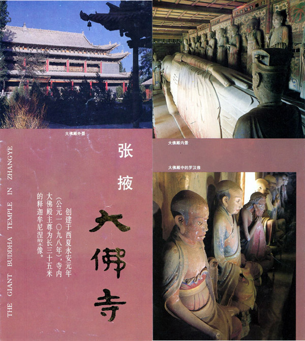 張掖の大涅槃仏と炳霊寺の石窟、そして北京の天壇 27日。朝、徒歩でウルムチ駅まで移動。 9時25分発の鄭州行の特快に乗りたい。めざす張掖着は翌日午前中11時半ころの到着予定。しかし、前夜ウルムチに着いたばかりなので、もちろん乗車券は買っていないし寝台券が取れる見込みもない。 どうするか? 当時は乗車券なしで列車に乗り込み、車内で購入という手が使えたので、その手を使うことにした。 改札が開始され列が進んで自分の番になり、改札の駅員が「トルファンか?」と聞いてきた。近距離ならば乗車券なしでもいいけど、という雰囲気だったので、「そうだ」とうなずいてホームに出た。 乗車後、車内の切符売り場で寝台にあきがあるかと尋ねたが「ない」と言われ、硬座のチケットを購入。しかし、まだ、寝台の確保はあきらめない。軟臥車の通路にある収納式の腰掛にすわって時間をすごした。ちょっと体調悪いんです、という表情をしながら。そして、列車長に寝台にあきがないかと尋ねるチャンスをうかがった(普通、何かのために寝台が1つか2つ確保されているらしいので-確保されているのは軟臥であるというのが通説だった)。我ながらセコイ作戦である。 作戦は成功。14時30分すぎ、軟臥がとれた。 28日。 11時30分すぎ、張掖到着。駅前で地元の若者に声をかけられた。(あとから楊君という蘭州大学の学生であることがわかった)。 張掖に来た目的はただ一つ。この街に残る、マルコポーロも見た大涅槃仏を見ることである。 まずは腹ごしらえということで、楊君に勧められるまま、街中の食堂で牛肉麺を食べた。列車内でも、食堂車で夕食・朝食ともに肉絲麺(豚肉の細切り肉の入った麺)だったから3食連続で麺である。ちなみに昼食は食べていない(体調が悪いことになっていたので-笑)。 実は、この食事、楊君のおごりだった。この時は、まだ、彼が何者なのか知らなかったので、一応警戒すべきシチュエーションではある。 この後、楊君の案内で大仏寺へ。