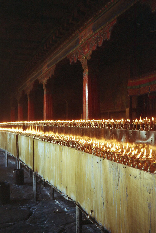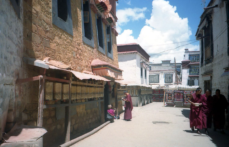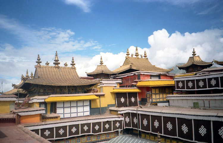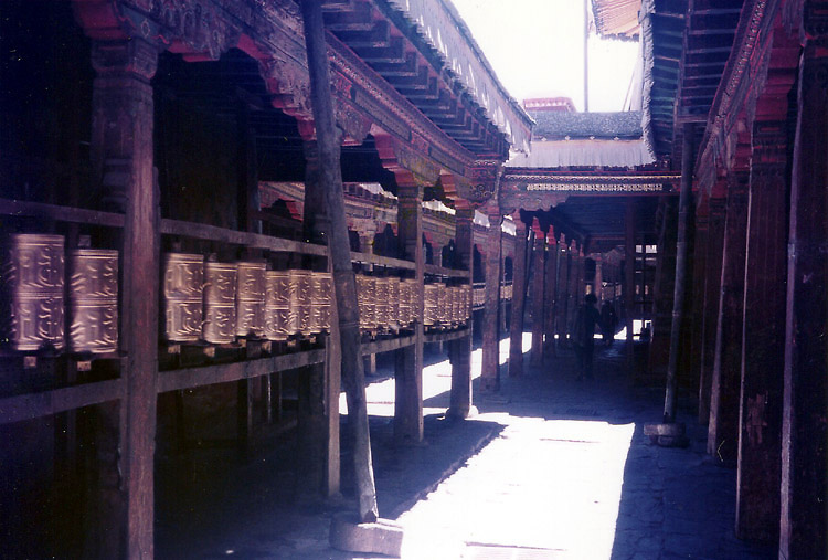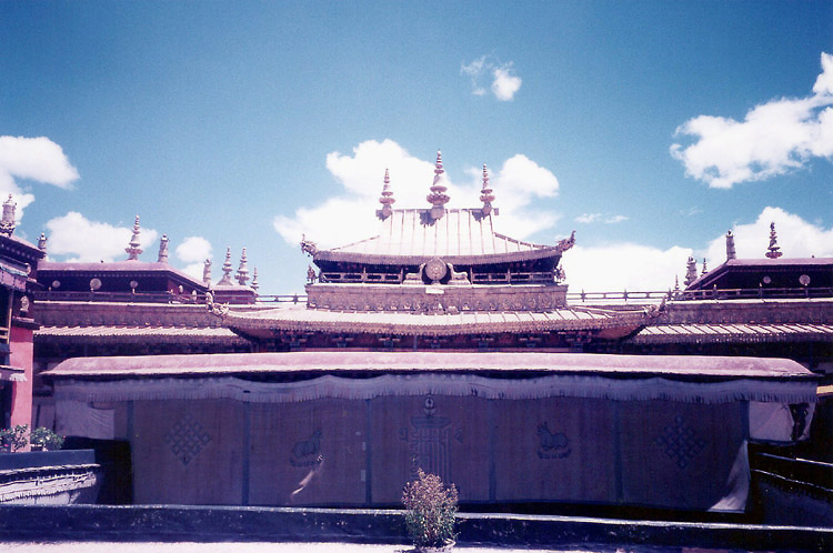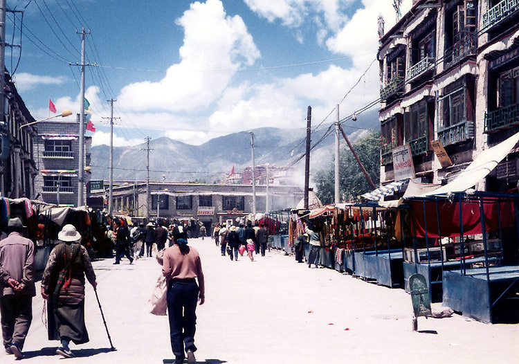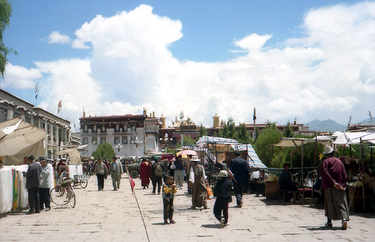 ラサ ラサに着いた翌日(22日)、まず、すべきことはラサ-成都-上海の航空券の確保だった。この旅は成田-カトマンズの片道航空券で出かけてきており、その先は完全に出たとこ勝負であった。それもこれも、カトマンズ-ラサの日程がまったく読めなかったからである。 さて、旅行を続ける日程的余裕はあり、もう少しチベット旅行をしてから帰国の途につくという選択肢もあった。しかし、最大の目的である、ネパールからヒマラヤを越えてチベットへ移動する陸路の旅は完了したせいか、旅を続けるモチベーションがあがらなかった。 結局、チベットにはあと2日だけ滞在して、帰国の途につくことにした。 運よく航空券は確保でき(最悪バスでの移動も考えていた)、午後は大昭寺(ヂョカン寺)へ出かけた。