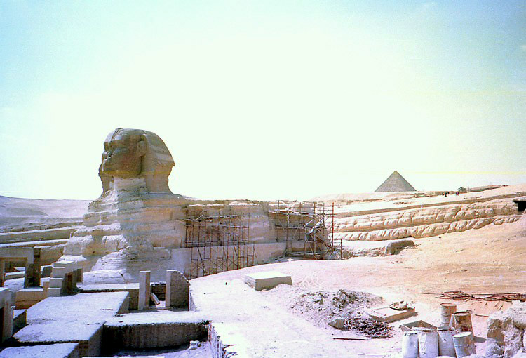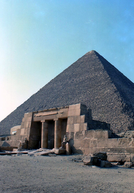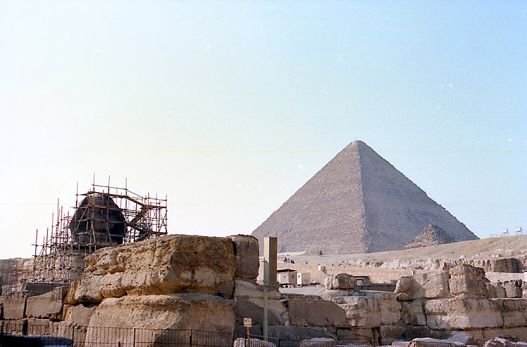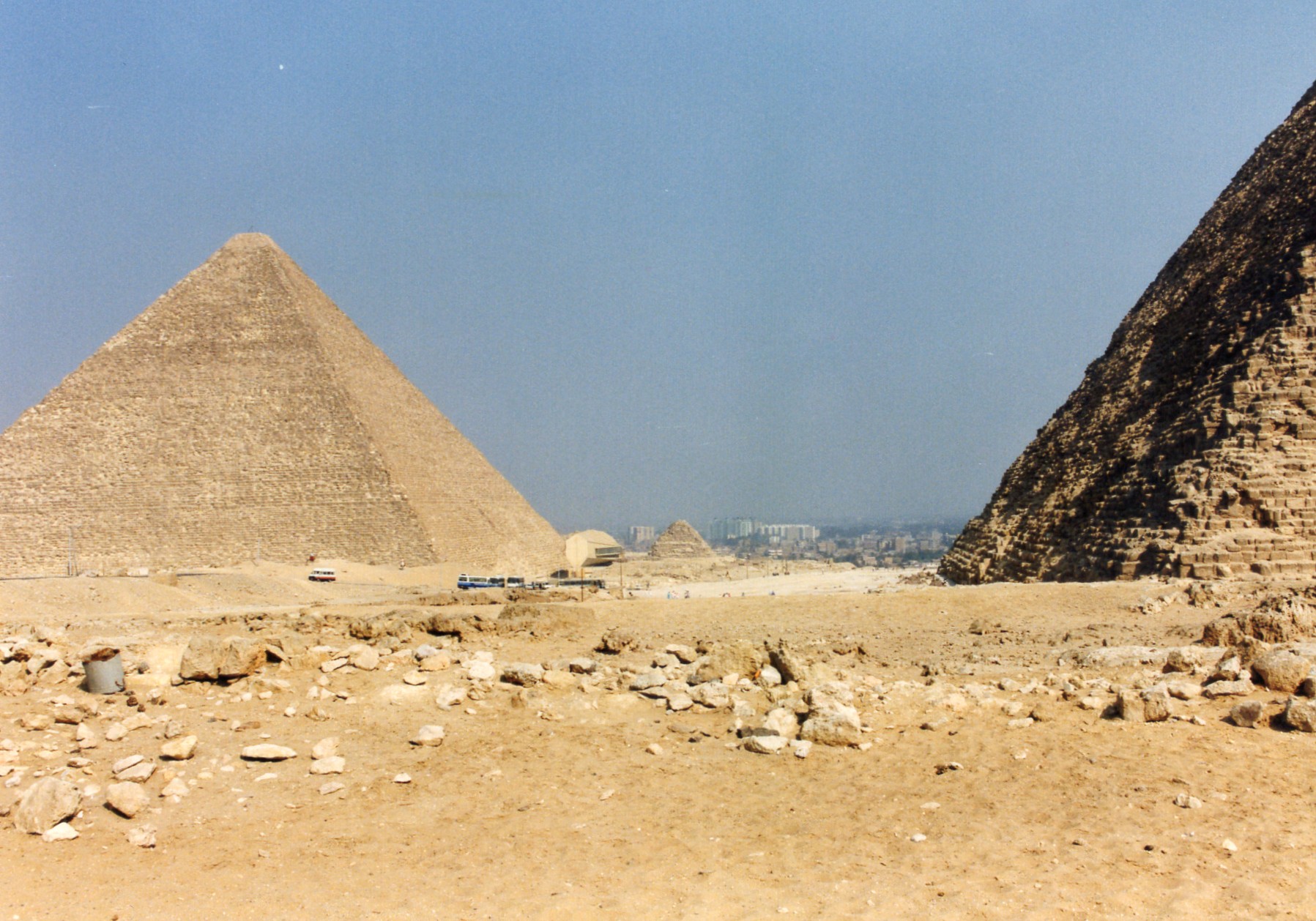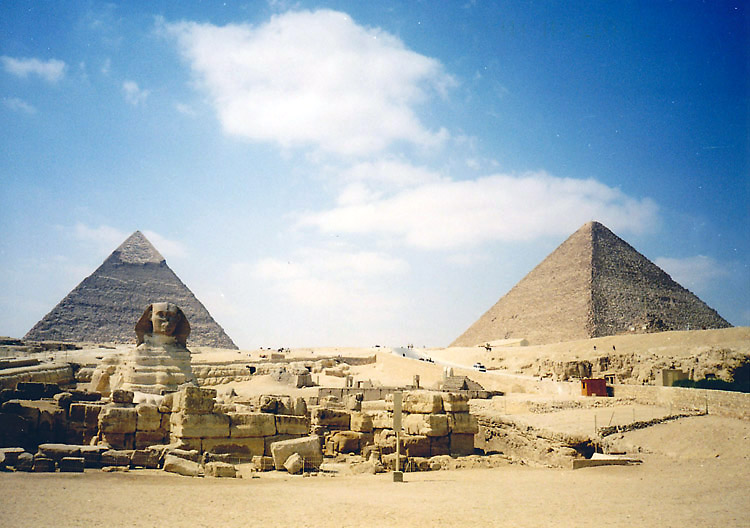 ギザには三つの巨大ピラミッド(三大ピラミッド)がある。およそ4500年前に建造された、エジプトの古王国第4王朝のクフ王、その息子のカフラー王、孫のメンカウラー王の3人のファラオのピラミッドである。ピラミッドについては、いまだ謎に包まれた部分が多いようなだが、4600年も前に人間が巨大な石材ブロックを積み上げて建造したということは月並みな言い方だが驚嘆すべきことで、現地で実物を見ると圧倒されるばかりだった。