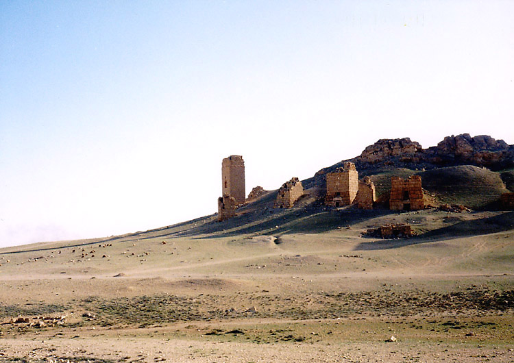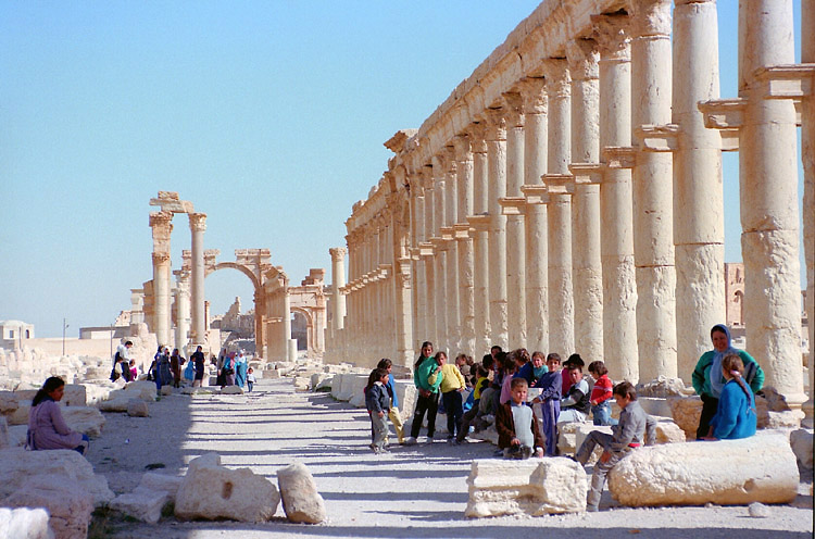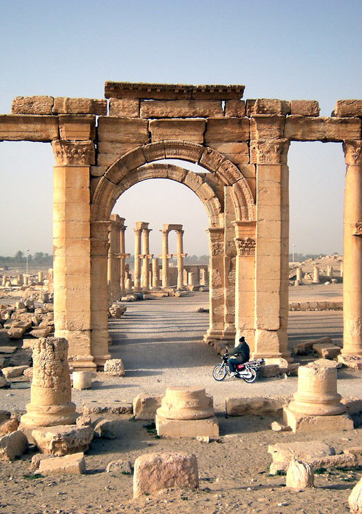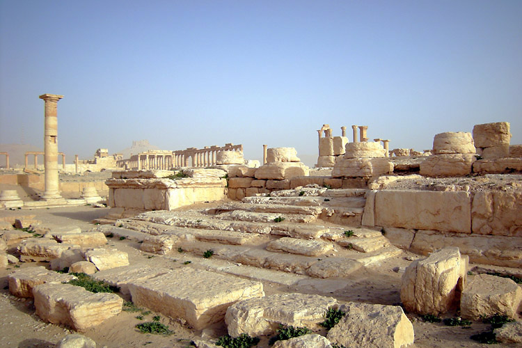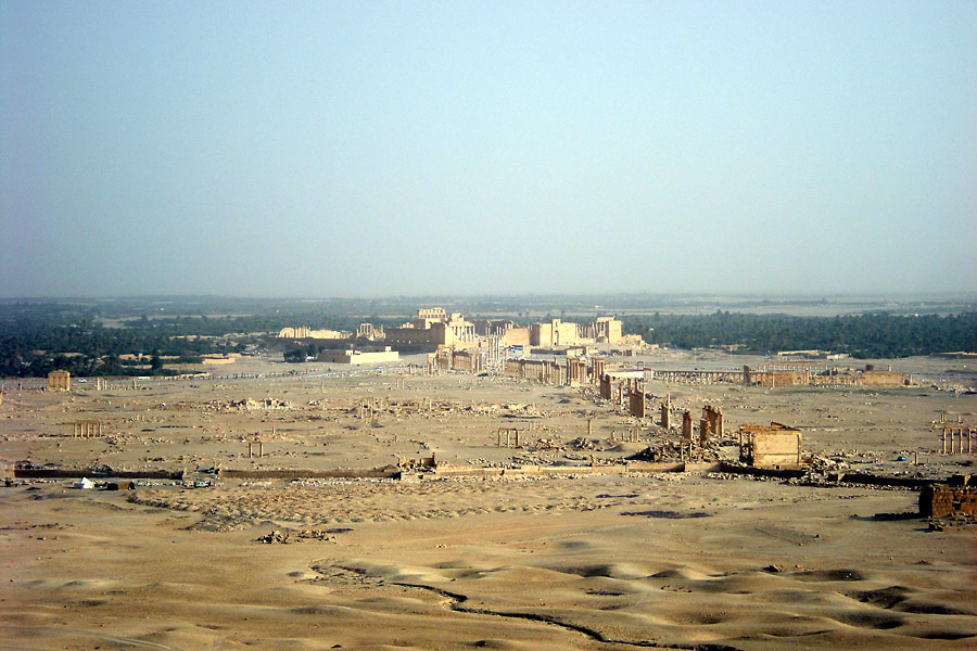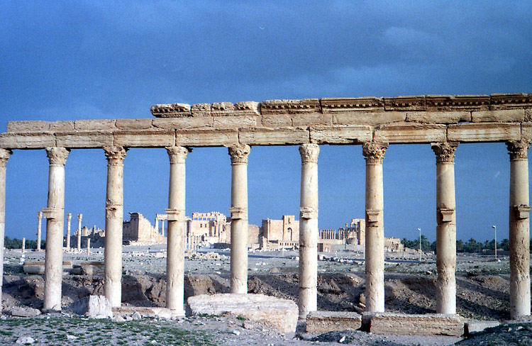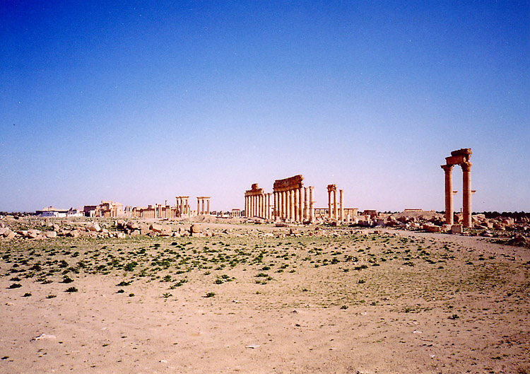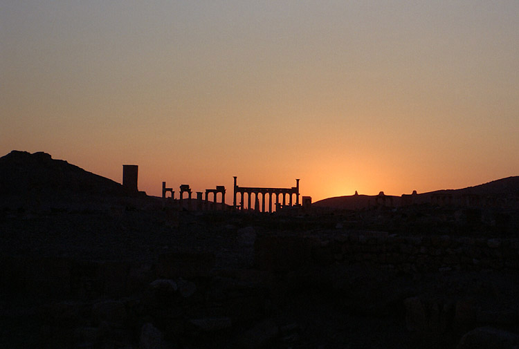 | パルミラはシリア砂漠のど真ん中に位置する。豊富な地下水が湧き出るオアシスで、紀元前1世紀から、地中海とメソポタミアを結ぶ交易路の中継地として栄えており、ローマ帝国と結んでいた。しかし、3世紀後半、パルミラの女王ゼノビアは、ローマから自立するという野心をいだき、結局ローマ軍に破れ、パルミラの街も壊滅に追い込まれた。ローマ帝国の街に特有の列柱道路が街の中心を貫いており、いくつかの神殿、劇場などの建造物が残る。(2015年、この地域を支配下に置いたISによっていくつかの建造物が爆破・破壊されてしまった。) 広大な遺跡だが、少し離れると遺跡全体を眺めことができる。パルミラ遺跡では、一つ一つの建造物やその遺構を見るよりも、ブラブラして遺跡の雰囲気に浸るのが個人的な好み。列柱の向こう側に沈む夕日も綺麗。