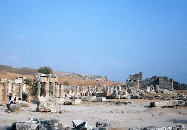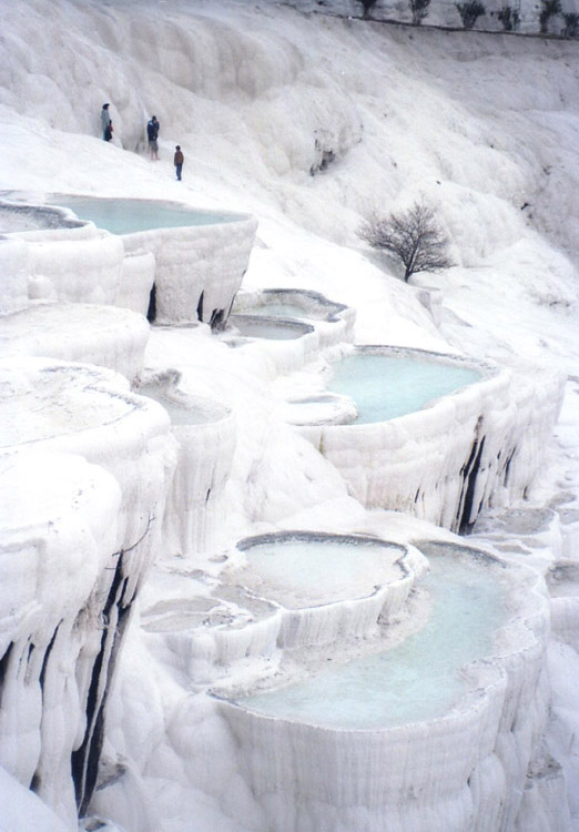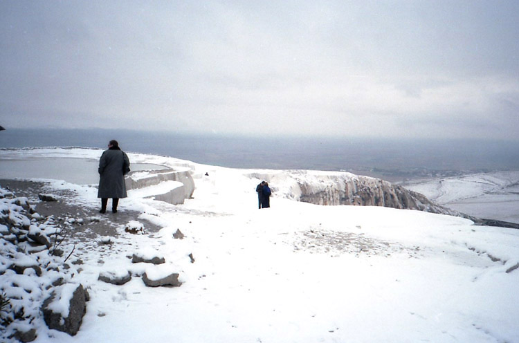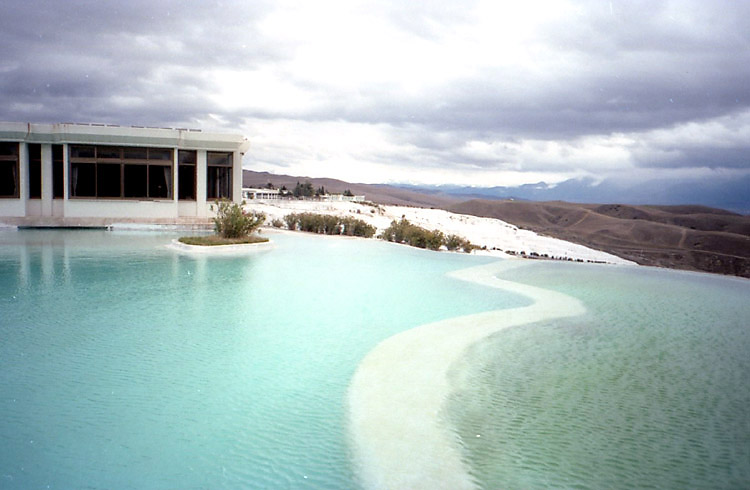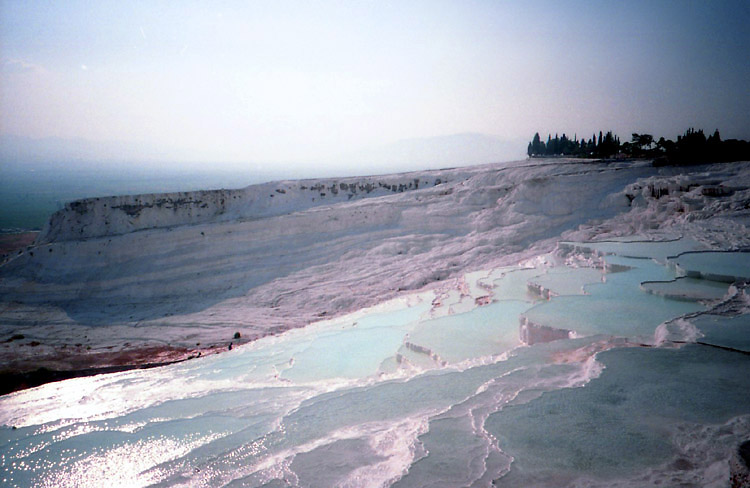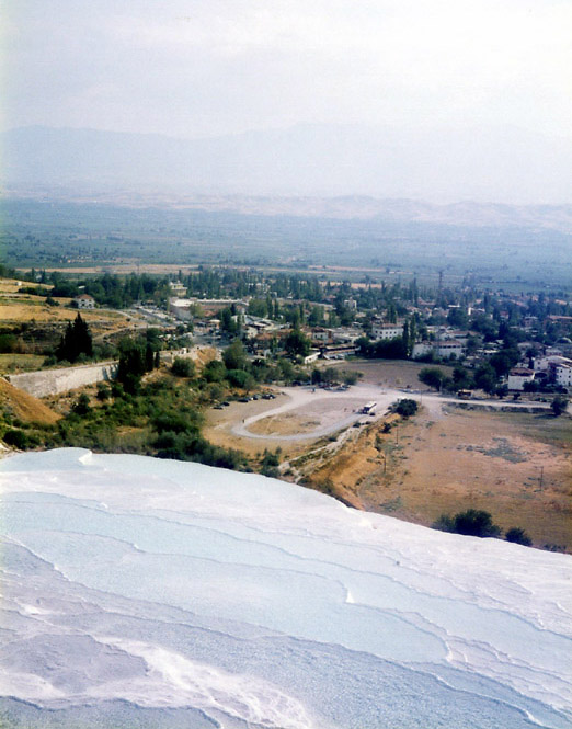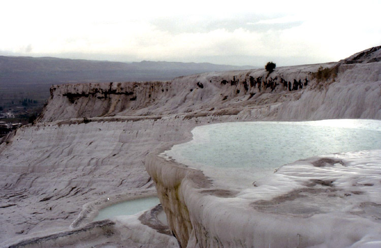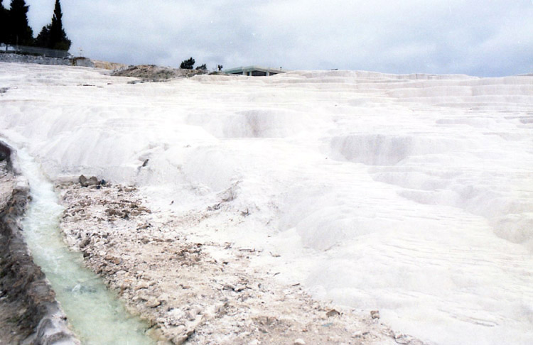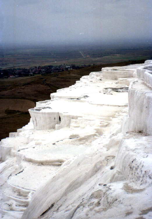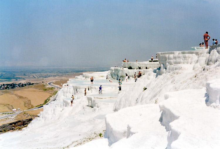 | <パムッカレ> パムッカレは温泉地で、その湯は高さ100mに及ぶ台地の斜面を伝って流れ落ち、湯に含まれた石灰分が結晶して階段状の石灰棚を形成している。しかし、乱開発のため温泉の湧出量が減少し、斜面を流れる湯量を抑え、また、景観保護のため石灰棚への自由な立ち入りは禁止され、遊歩道を歩いたり(裸足になる必要がある)、一部の石灰棚に入ることができるだけになっている。ここへは1988年11月、1992年3月、2002年8月に訪れている。1988年にはまだ、シーズンオフの11月であるにもかかわらず、石灰棚にどんどんお湯を流していた(残念ながら撮影済みのフィルムを失うという失態を演じてしまい写真はない)。まだ、温泉湧出量の減少が問題にはなっていなかったのだろうか? しかし、1992年3月には石灰棚へはお湯を流し込んではおらず(時々は流していたのか?)、このときには温泉の枯渇への対応が強く意識されていたのだと思われる。2002年8月にはごく一部の石灰棚のみにお湯を流すように調節されており(お湯がないと美しくないし、また流すことにより白さを維持しているらしく流す場所を計画的に変えているらしい-遊歩道脇は常に流していると思われるが)、また、観光客は自由に歩き回ることが禁止されていた。