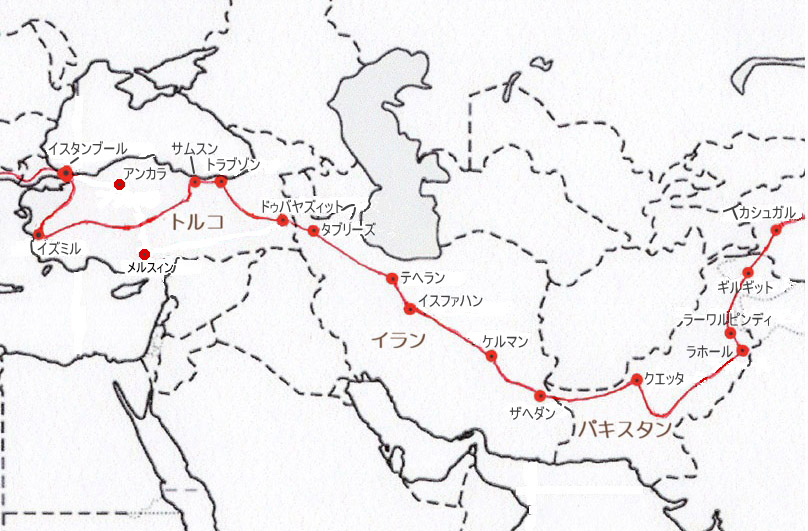 5.1997年8月:イスファハン(イラン)~ギルギット(パキスタン) ◆イスファハン~ケルマン(イラン)=バス ◆ケルマン~ザヘダン(イラン)=バス ◆ザヘダン~イラン側ボーダー=タクシー ◆パキスタン側ボーダー~クエッタ(パキスタン)=バス ◆クエッタ~ムルターン(パキスタン)=鉄道 ◆ムルターン~ラホール(パキスタン)=バス ◆ラホール~ラーワルピンディ(パキスタン)=バス ◆ラーワルピンディ~ギルギット(パキスタン)=バス 6.1996年8月:テヘラン~ドゥバヤズィット ◆テヘラン(イラン)~タブリーズ(イラン)=バス ◆タブリーズ~イラン側ボーダー=バス ◆トルコ側ボーダー~ドゥバヤズィット(トルコ)=タクシー 7.1994年7月:トラブゾン(トルコ)~ドゥバヤズィット(トルコ) ◆トラブゾン~エルズルム=バス ◆エルズルム~ドゥバヤズィット=バス 8.1988年11月:セルチュク(トルコ)~トラブゾン(トルコ) ◆セルチュク~デニズリ=バス ※トルコへはマルマリスから入国し、そこからセルチュクまで移動 ◆デニズリ~コンヤ=バス ◆コンヤ~ネヴシェヒル=バス ◆ネヴシェヒル~カイセリ=バス ◆カイセリ~シヴァス=バス ◆シヴァス~サムスン=バス ◆サムスン~トラブゾン=バス 9.1994年3月:セルチュク(トルコ)~イズミル(トルコ)=バス ※1992年3月にマルマリスからイズミルまでバスで移動しており、その際、そのバスがセルチュクを経由してこのルートを踏破したかもしれない。 10.1988年11月:イズミル(トルコ)~イスタンブール(トルコ) ◆イズミル~ベルガマ=バス・ドルムシュ(イズミルからのバスはベルガマへ行かないバスだったので途中で下車しドルムシュに乗り継ぎ) ◆ベルガマ~クヌク=ドルムシュ ◆クヌク~ソマ=ドルムシュ ◆ソマ~バルケシル=ドルムシュだったかバスだったか? ◆バルケシル~ブルサ=バス ◆ブルサ~イスタンブール=バス ※3度ほど鉄道を利用してイスタンブールに出入りしたが、イスタンブールの始点・終点はアジア側のハイダルパシャ駅で、ヨーロッパ側との行き来はフェリーを利用したので厳密には陸路横断ルートの踏破にはならないと考え、地図には完全な陸路移動をしたルート(ポスポラス海峡にかかる橋を通ったルート)を示した。